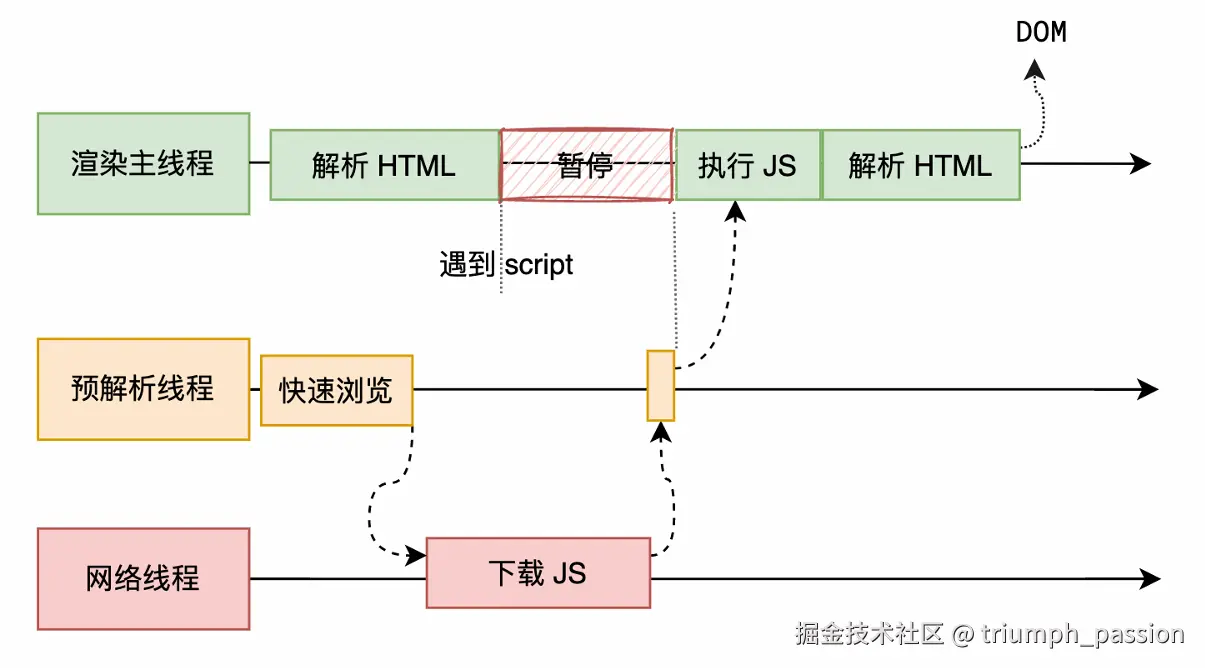 渲染主线遇到 JS 时必须暂停一切行为,等待下载执行完后才能继续