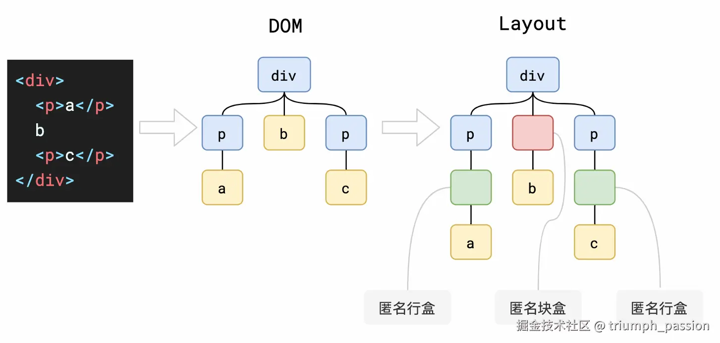 比如display:none的节点没有几何信息,因此不会生成到布局树;又比如使用了伪元素选择器,虽然 DOM 树中不存在这些伪元素节点,但它们拥有几何信息,所以会生成到布局树中。还有匿名行盒、匿名块盒等等都会导致 DOM 树和布局树无法一一对应。