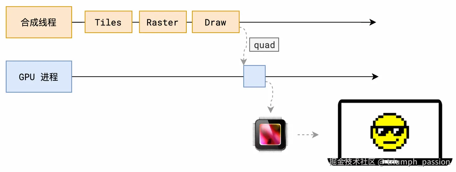 合成线程会把 quad 提交给 GPU 进程,由 GPU 进程产生系统调用,提交给 GPU 硬件,完成最终的屏幕成像。