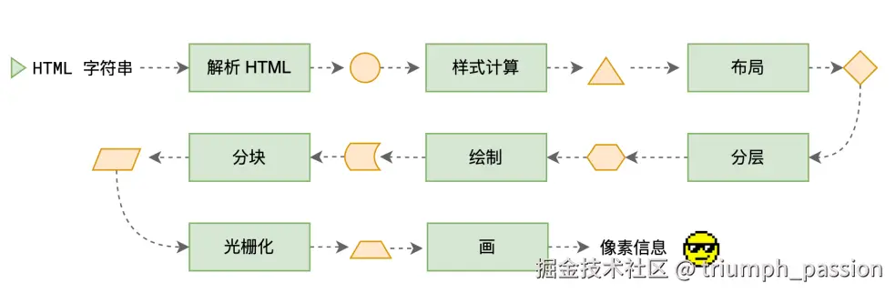 整个渲染流程分为多个阶段,分别是: HTML 解析、样式计算、布局、分层、绘制、分块、光栅化、画