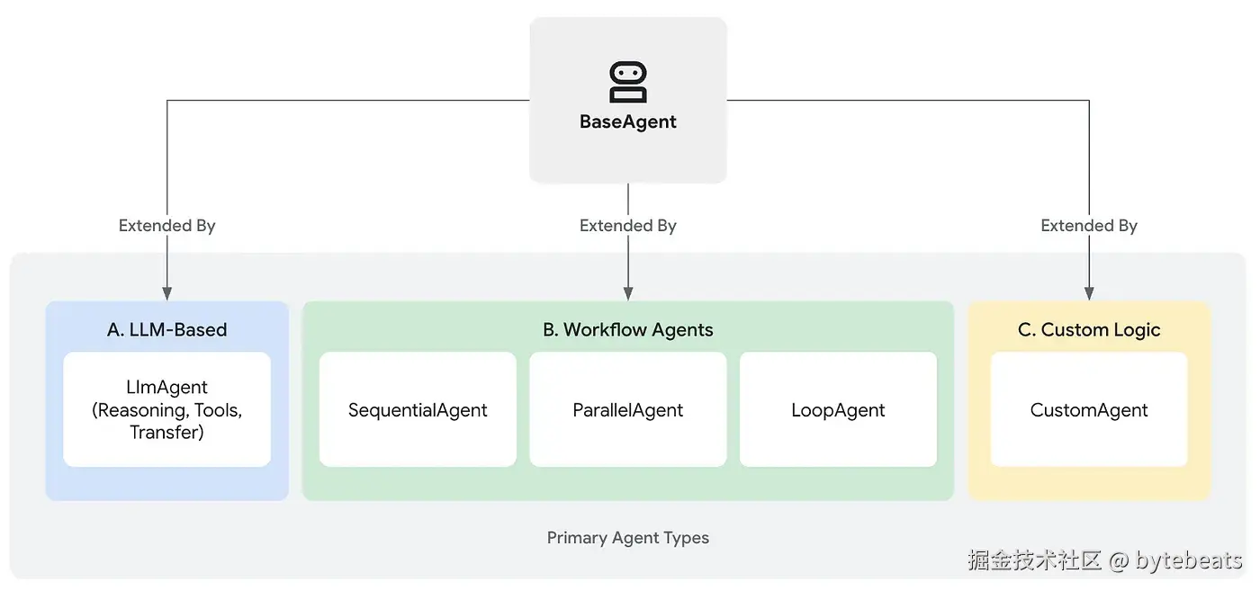 LLM Agent (如 LlmAgent, Agent) : 使用 LLM 来理解, 推理, 计划和行动--非常适合动态的, 语言驱动的任务. 工作流Agent (例如, 顺序Agent(SequentialAgent), 并行Agent(ParallelAgent), 循环Agent(LoopAgent) : 以可预测的模式协调其他Agent, 无需依赖 LLM 进行流程控制--最适合结构化, 可重复的流程. 自定义Agent: 通过扩展 BaseAgent 来构建, 以启用自定义逻辑, 专门工作流或独特工具集成--非常适合高级定制解决方案.