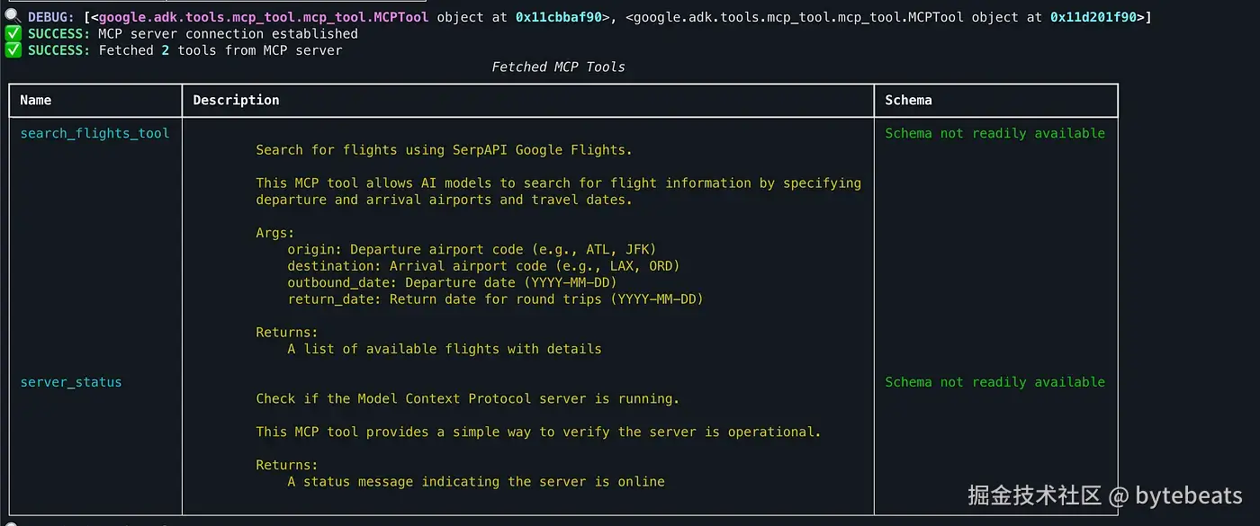 MCPToolset连接到 MCP 服务器, 并检索Agent可使用的可用工具列表. - 将工具整合到Agent中: 将发现的工具调整为与 ADK Agent兼容的格式, 以便在Agent执行期间无缝调用.