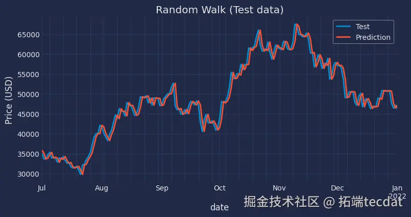 - 随机游走模拟(基线模型) :在生成预测模型时,首先确定一个基线模型用于比较。根据随机游走理论,在金融市场中,市场价格表现为随机行为,而非时间序列的函数。因此,最简单的可行模型是将当前时刻的值作为下一时刻的预测值,即使用