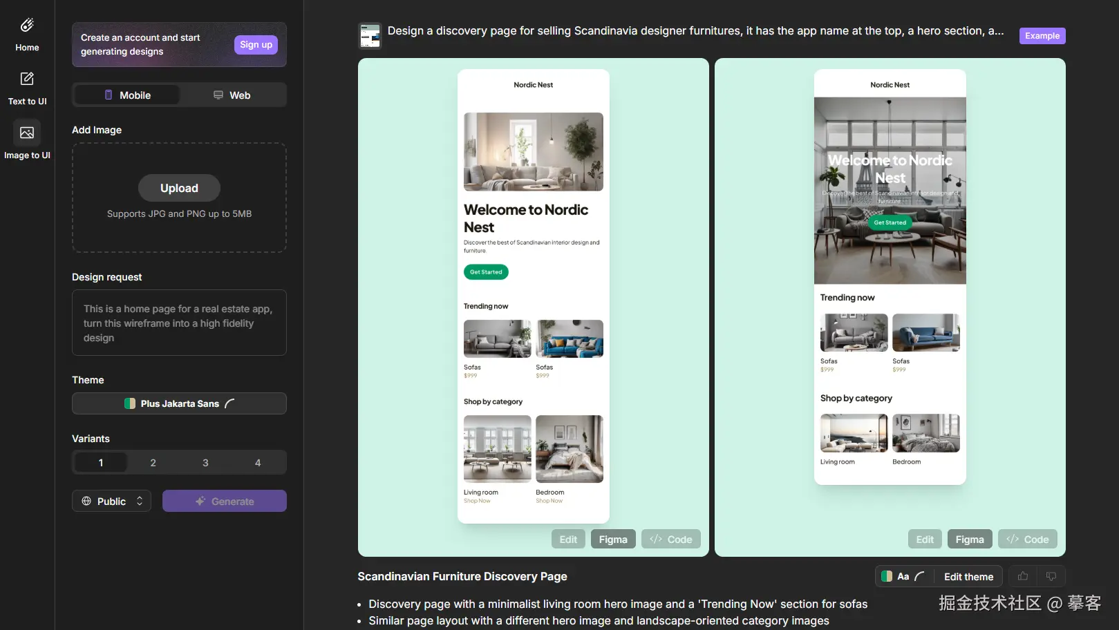 图像生成UI:上传草图或参考图,AI自动转化为高保真的UI设计。