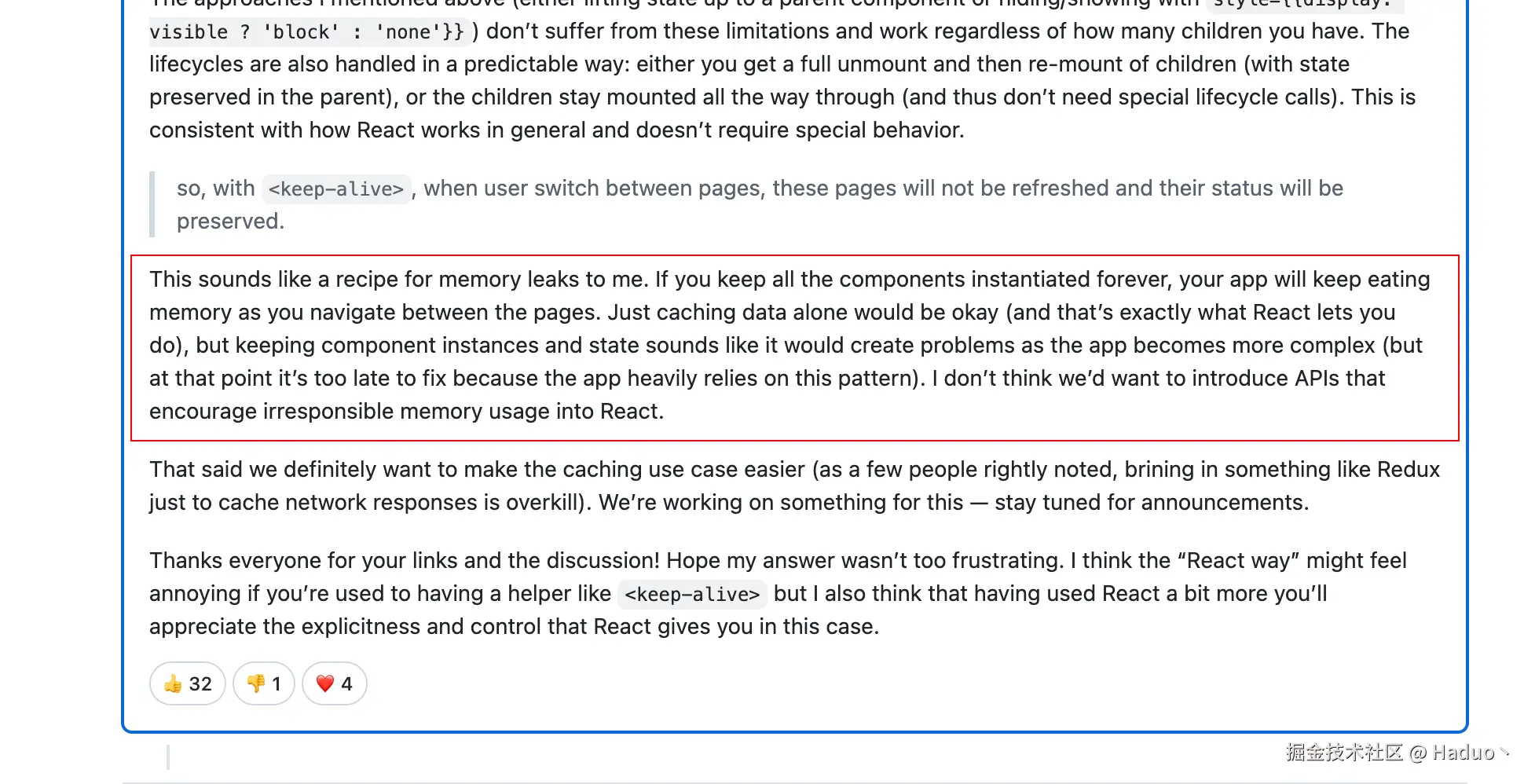 react为什么不做keepalive,在Dan认为这是一种内存泄漏,不利于掌控