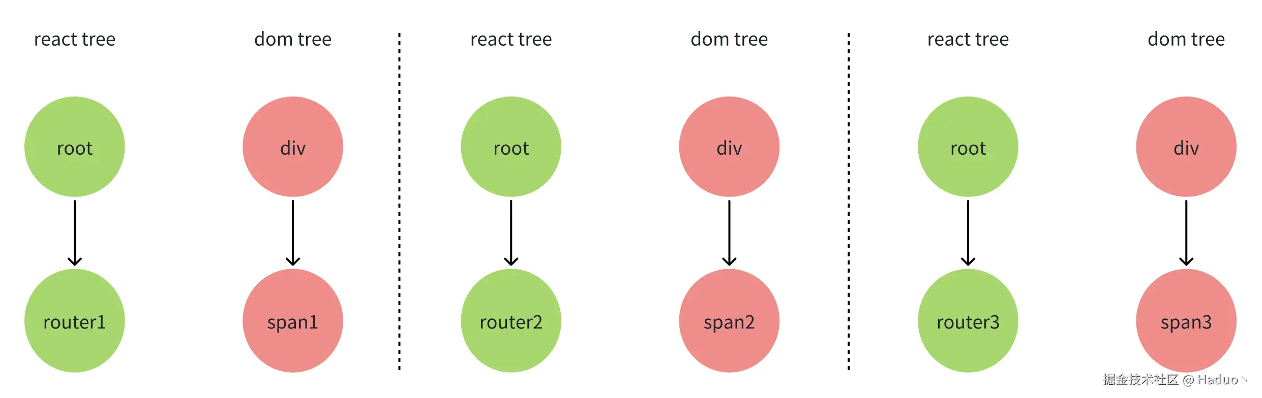 在路由切换时,react tree只会根据路由匹配到一个路由组件,然后生成对应的dom tree(其实中间还有fiber tree的构建,组件的状态其实是挂在fiber节点的hooks链表上的,这里就不解释了)