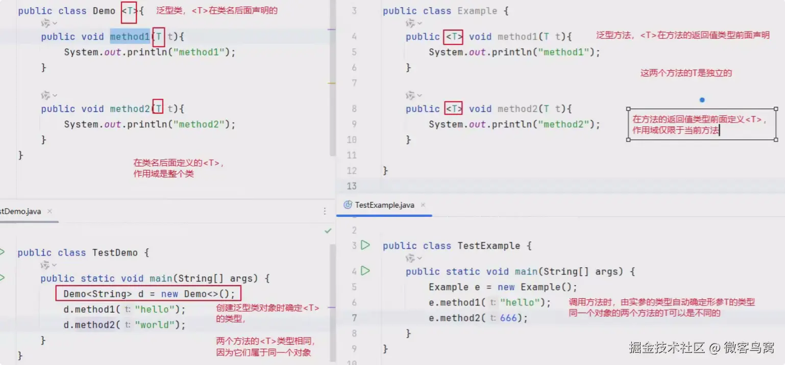 <T>中T可以当做独立的类型使用,?不能独立使用,只能结合泛型类或泛型接口使用。- 同一个方法中,