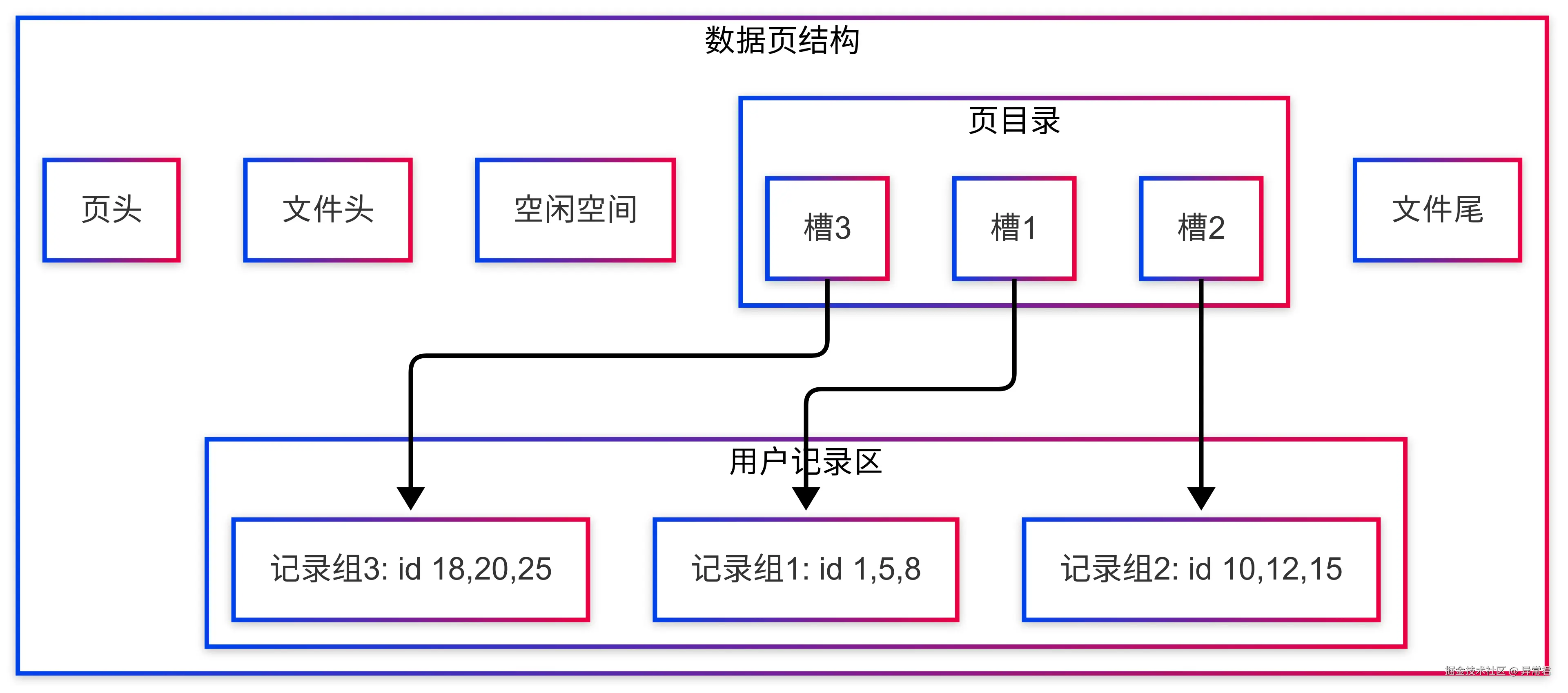 - 页目录由多个"槽"(slot)组成,每个槽指向一个记录组的最后一条记录