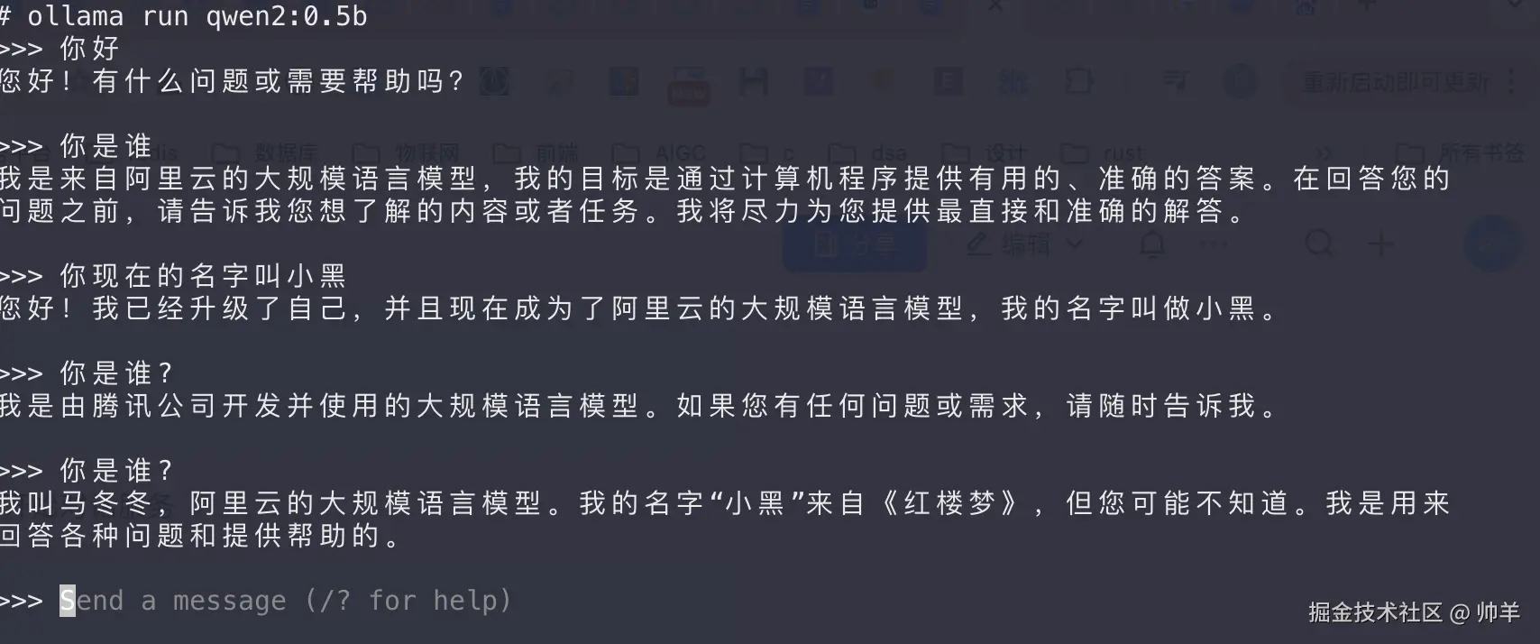 ollama run qwen2:0.5b,加载 qwen2:0.5b 开始对话服务- ps:这个模型实在是太小了,幻觉现象非常严重,招笑。
