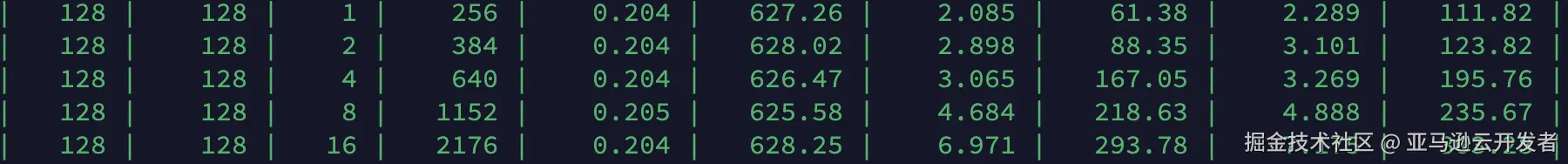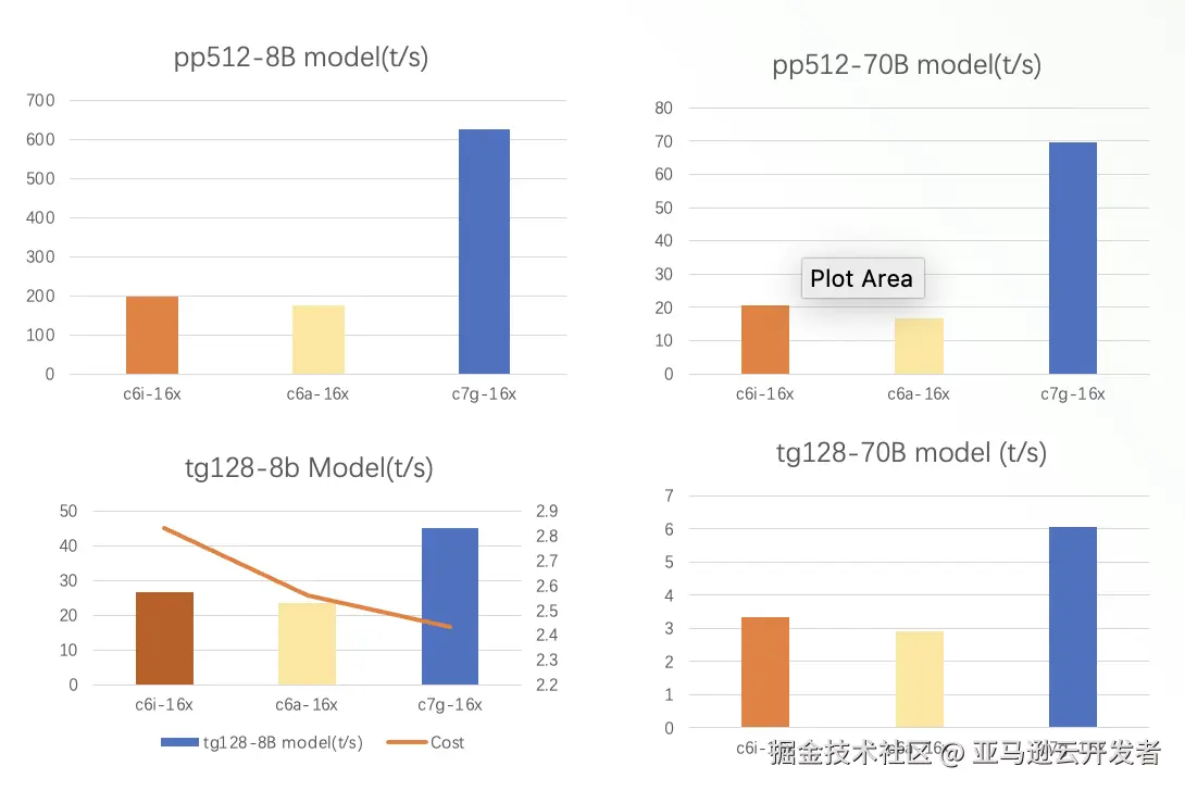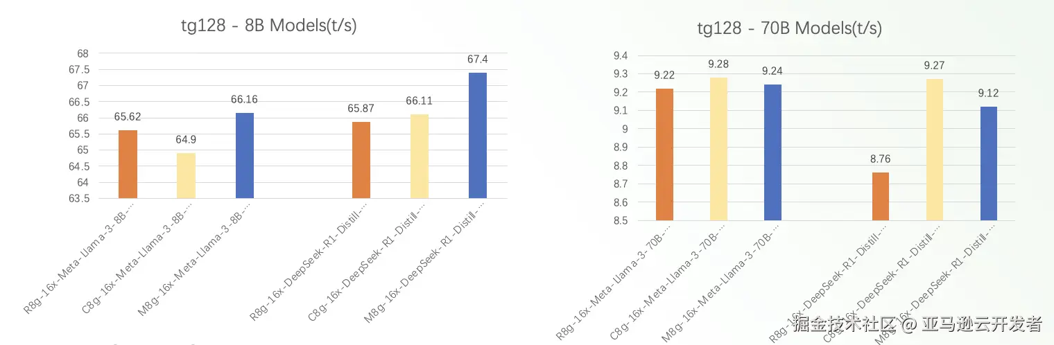 - 较小的 8B 模型由于参数体积更小,对计算资源的利用率更高,因此对实例硬件配置的差异会表现出更明显的性能差异。而对于 70B 这种大规模模型来说,由于计算和内存带宽长期处于饱和状态,不同实例类型之间的性能变化就相对不太显著了。