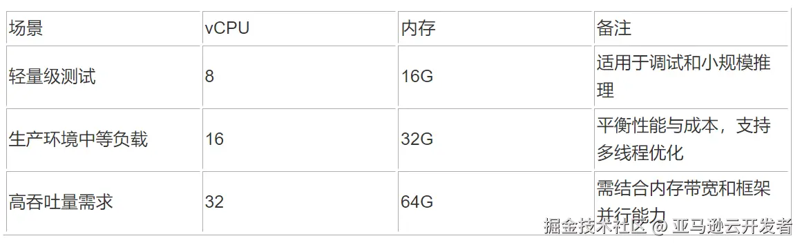 - 由上面测试 3 的图可以看出因为推理框架支持多线程,增加 vCPU 可以提升 prompt 处理的吞吐量。但随着 vCPU 核心数增加,token 生成的速度仅有小幅提升,进一步增加到 24 核,系统提升也相当有限。所以我们可以以 8 个 vCPU 进行初始实测,然后逐步调整力争达到客户需求的 SLA。