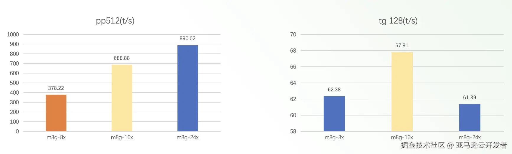 - 另一方面,tg128 模拟了生成 128 个 token 的场景,可以对应文本续写或对话生成等应用。但是,与 pp512 不同的是,tg128 的吞吐量随着 vCPU 核心数的增加,提升空间并不太大。从 8 核到 16 核,吞吐量仅有小幅提升,进一步增加到 24 核时,性能提升也相当有限。