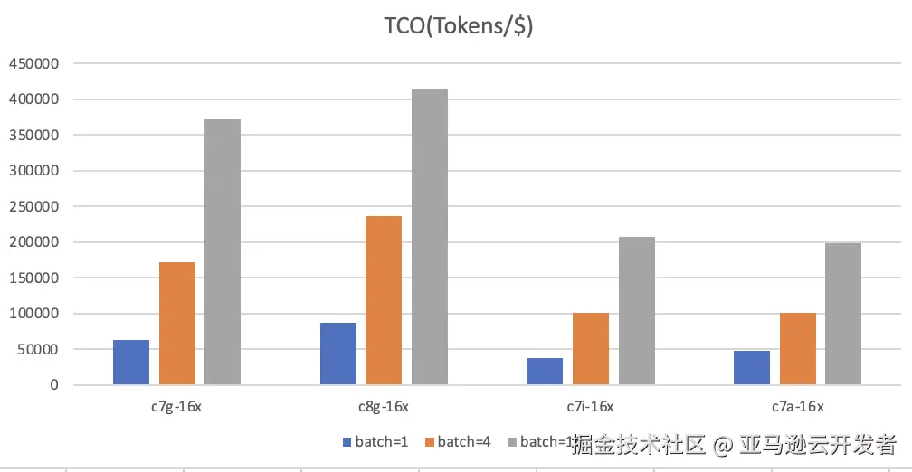 由图中可以看出,Graviton3 可以在 1 美元 cost 下生成 360000 token,而 Graviton4 可以生成多达 420000+ 的 token。这不仅说明 Graviton4 在 CPU 领域处于领先地位,而且对于那些希望从小规模开始,并在 LLM 应用之路上逐步扩展的用户来说,也提供了一个极具吸引力的优势。