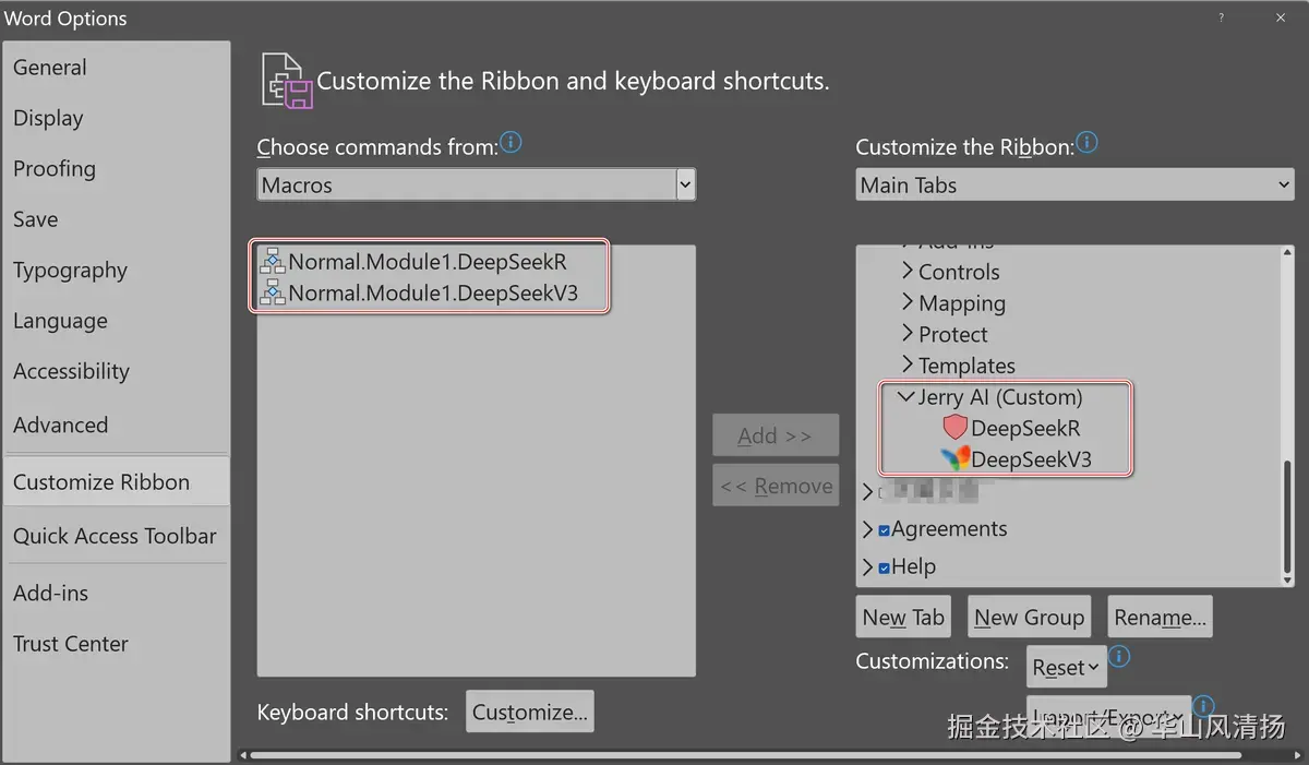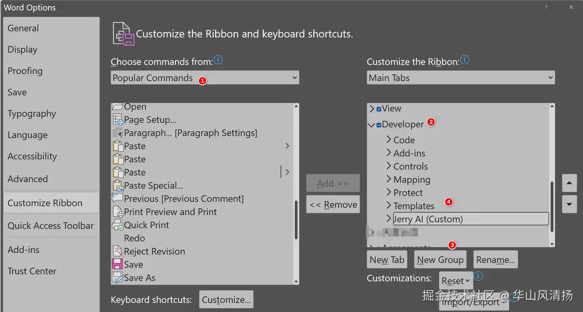 操作方式如下:在 Word 的 File->Options 选项中,选取 Customize Ribbon,然后将左侧的 Developer 标签移至右侧,接着在 Developer 标签下新建一个 Group,并为其命名,名称可自行确定。 待会儿,我们可将创建好的宏放置于这个 Group 之内。