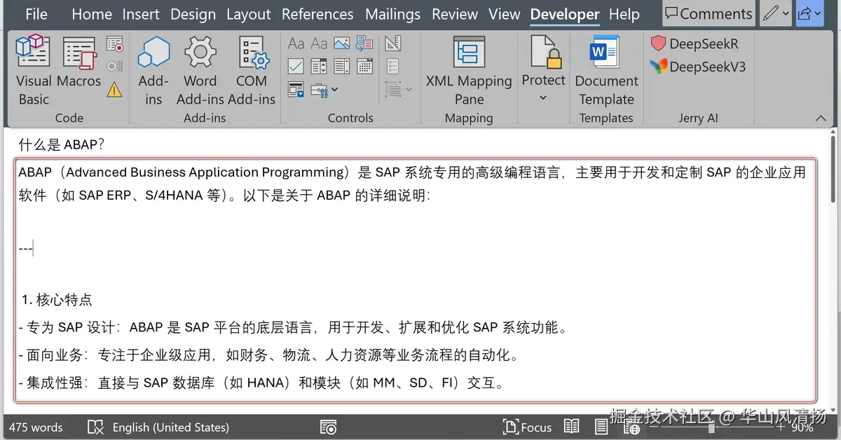 DeepSeek API 调用之后,response 自动填充到了 Word 里。
