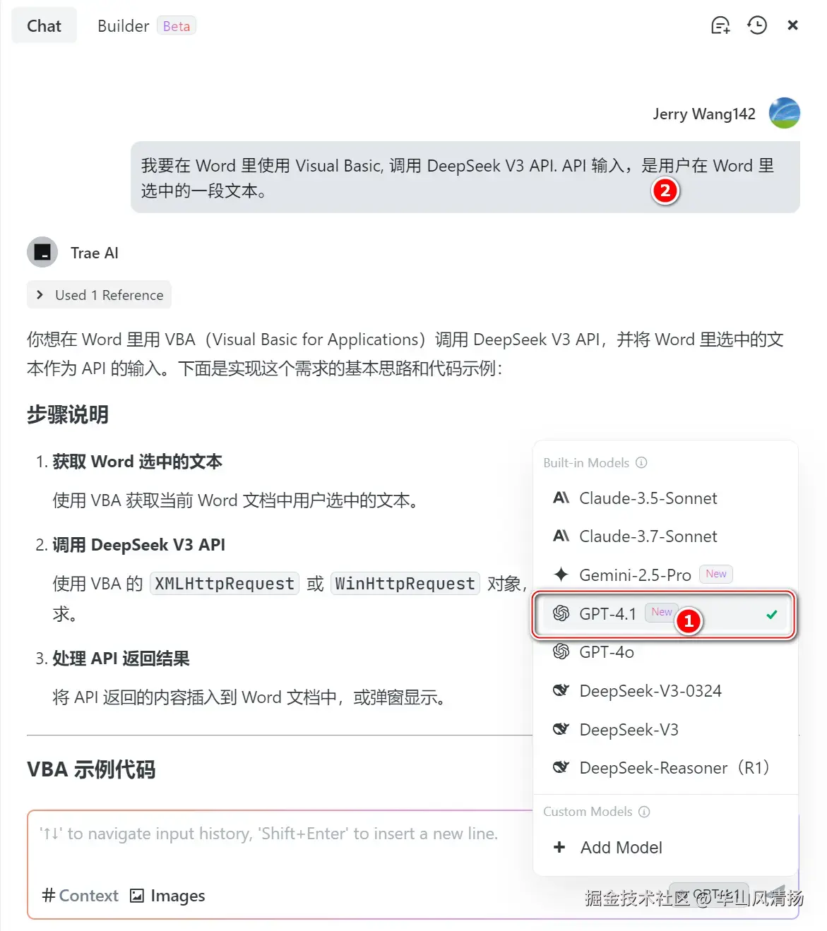 我要在 Word 里使用 Visual Basic, 调用 DeepSeek V3 API. API 输入,是用户在 Word 里选中的一段文本。