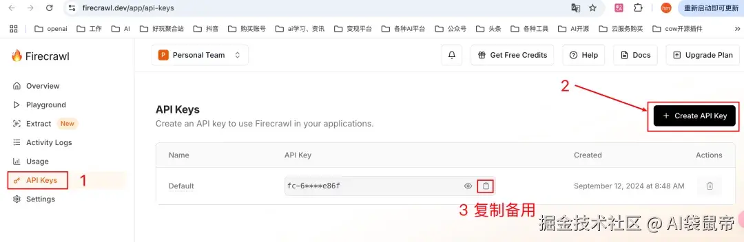 这次也不用咱们费劲巴拉去部署Firecrawl Firecrawl同样有云平台使用,进入它的官网创建一个apikey,复制备用 www.firecrawl.dev/app/api-key…