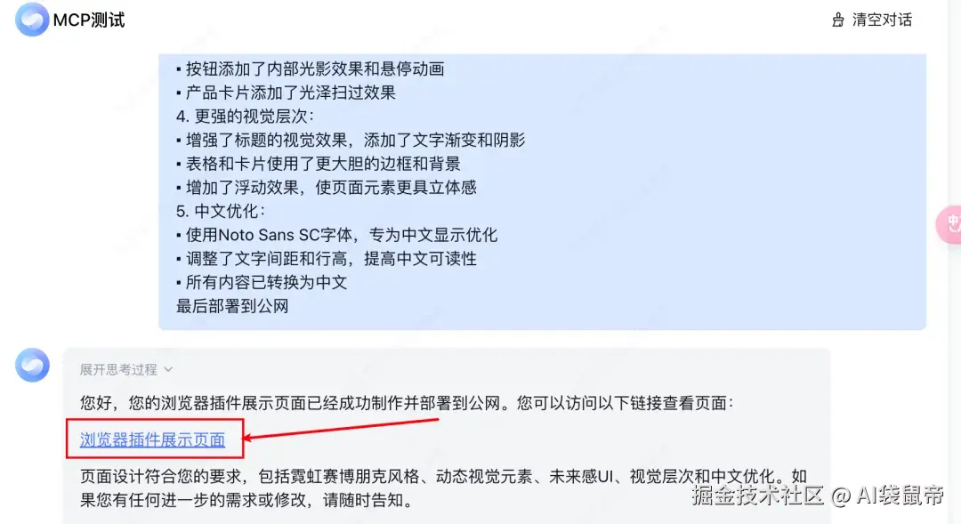 模型选择的是DeepSeek-R1 会边思考边选择合适的工具进行调用 不一会儿,网页就生成、并部署好了,链接会通过下图的方式给出
