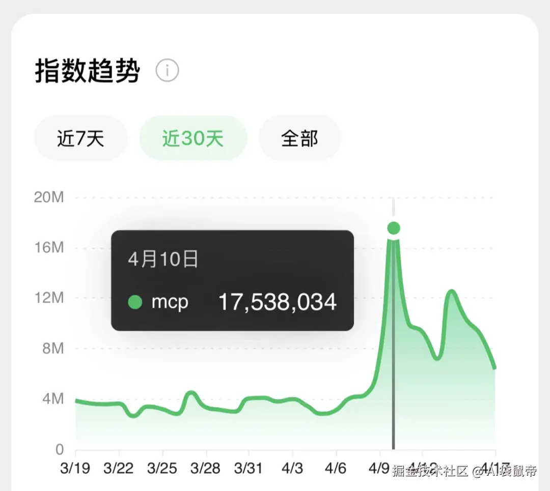 可以看到MCP最近30天最高的热度是1700多万,而DeepSeek是2亿。