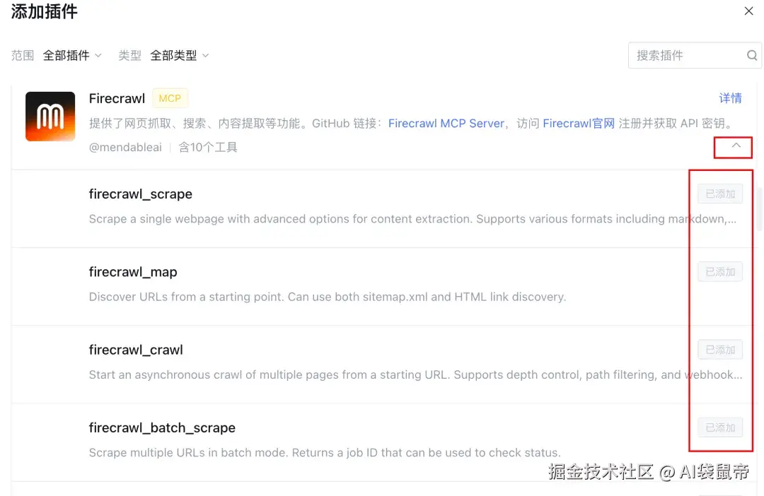 回到LKE,还是老规矩,点开添加插件,找到Firecrawl MCP,展开之后把里面的功能全添加。