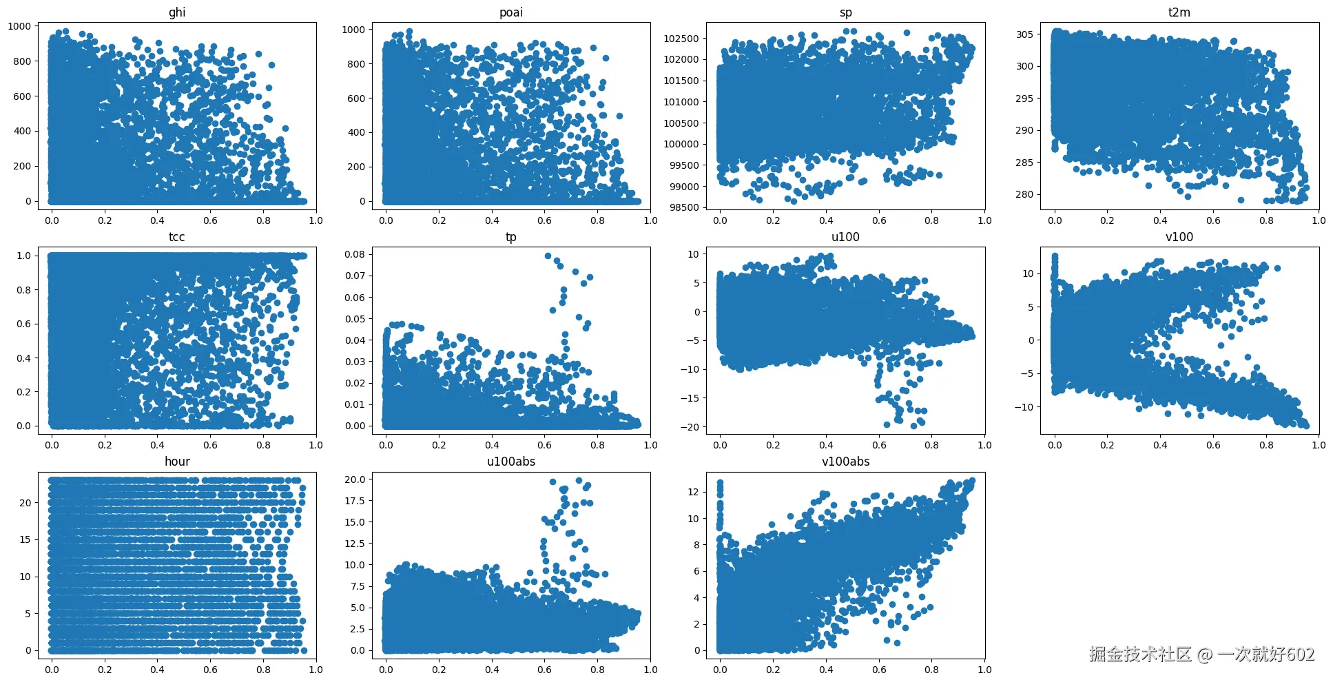 可以发现,风电与u100的绝对值呈明显的正相关,加入特征集
