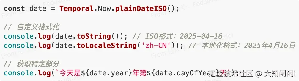 // 创建当前日期const today = Temporal.Now.plainDateISO();console.log(today.toString()); // 输出:2025-04-16// 创建特定日期const birthday = Temporal.PlainDate.from({ year: 2025, month: 7, day: 15 });console.log(birthday.toString()); // 输出:2025-07-15// 创建日期时间const meeting = Temporal.PlainDateTime.from({year: 2025, month: 4, day: 20, hour: 14, minute: 30});console.log(meeting.toString()); // 输出:2025-04-20T14:30:00