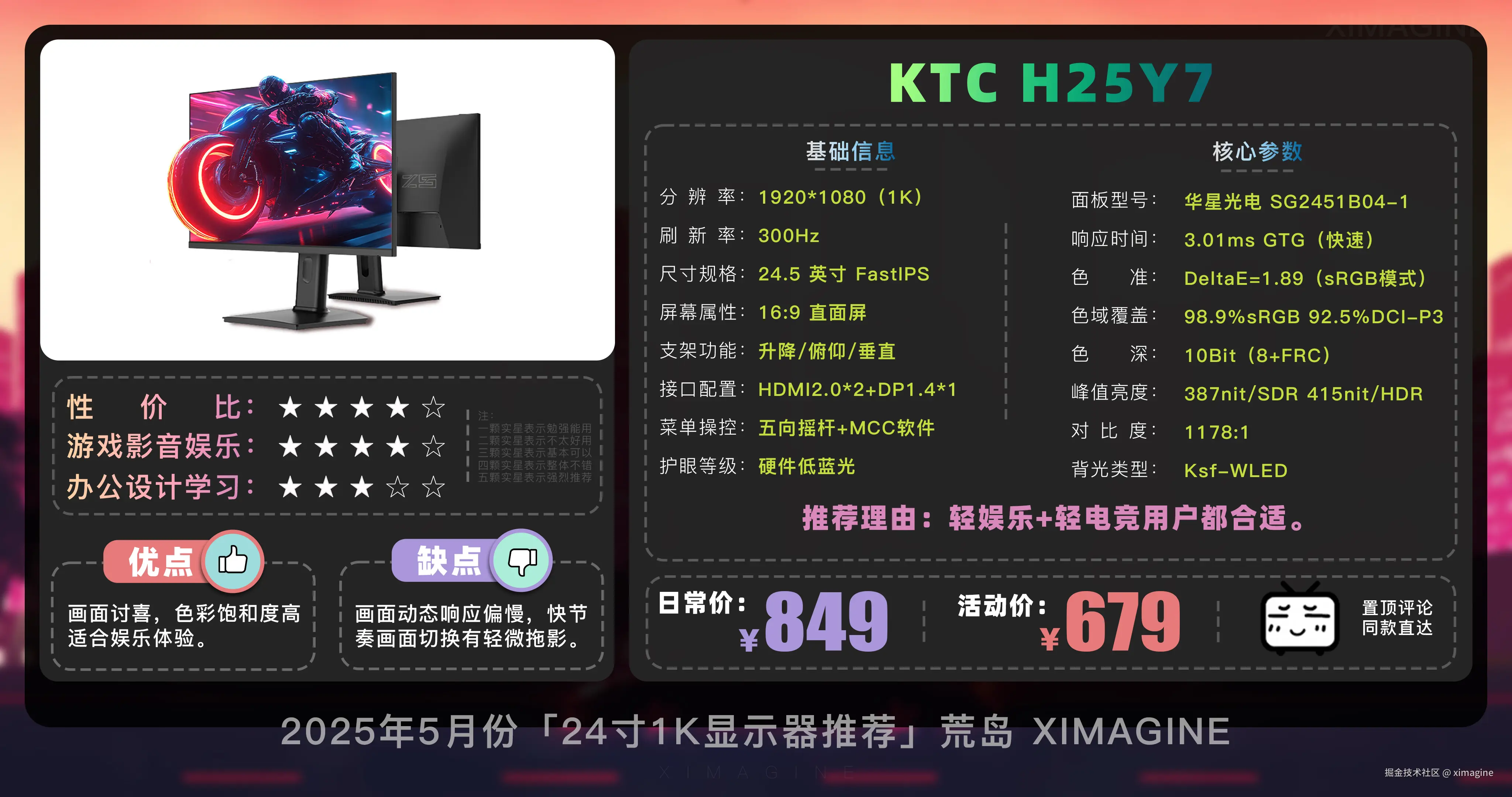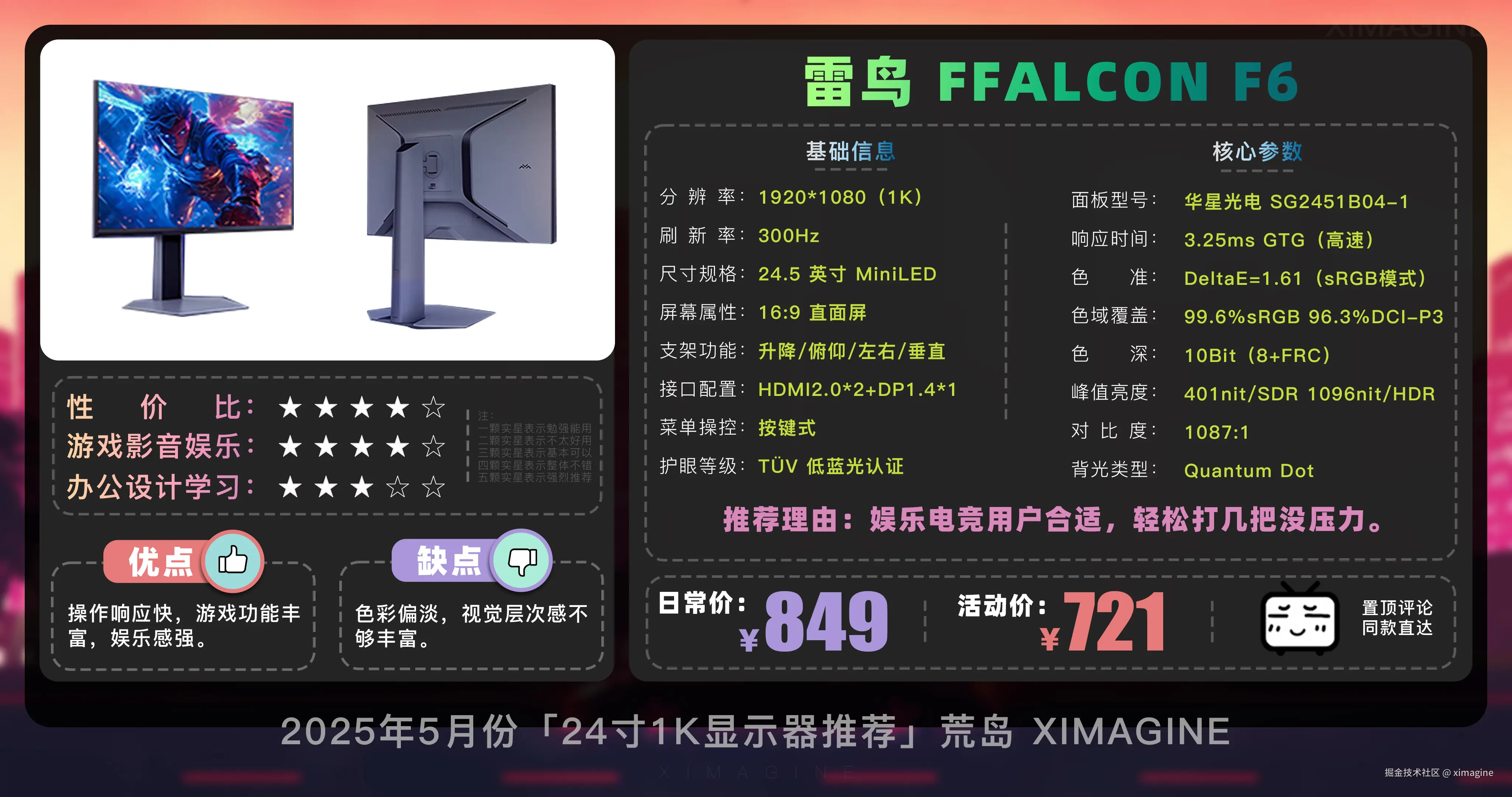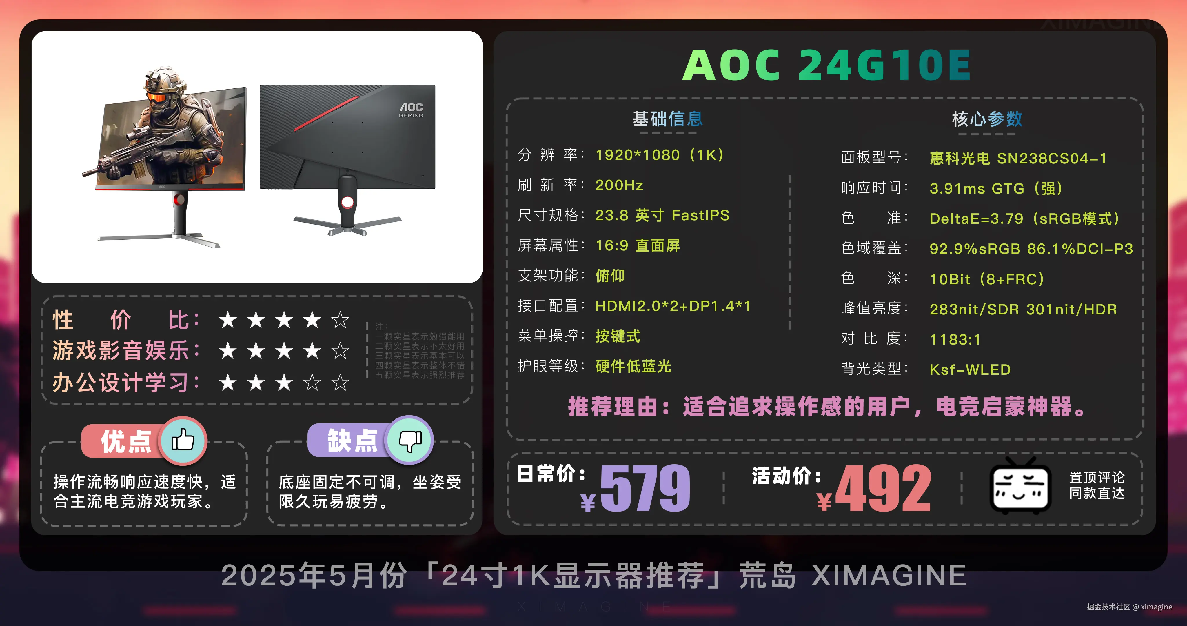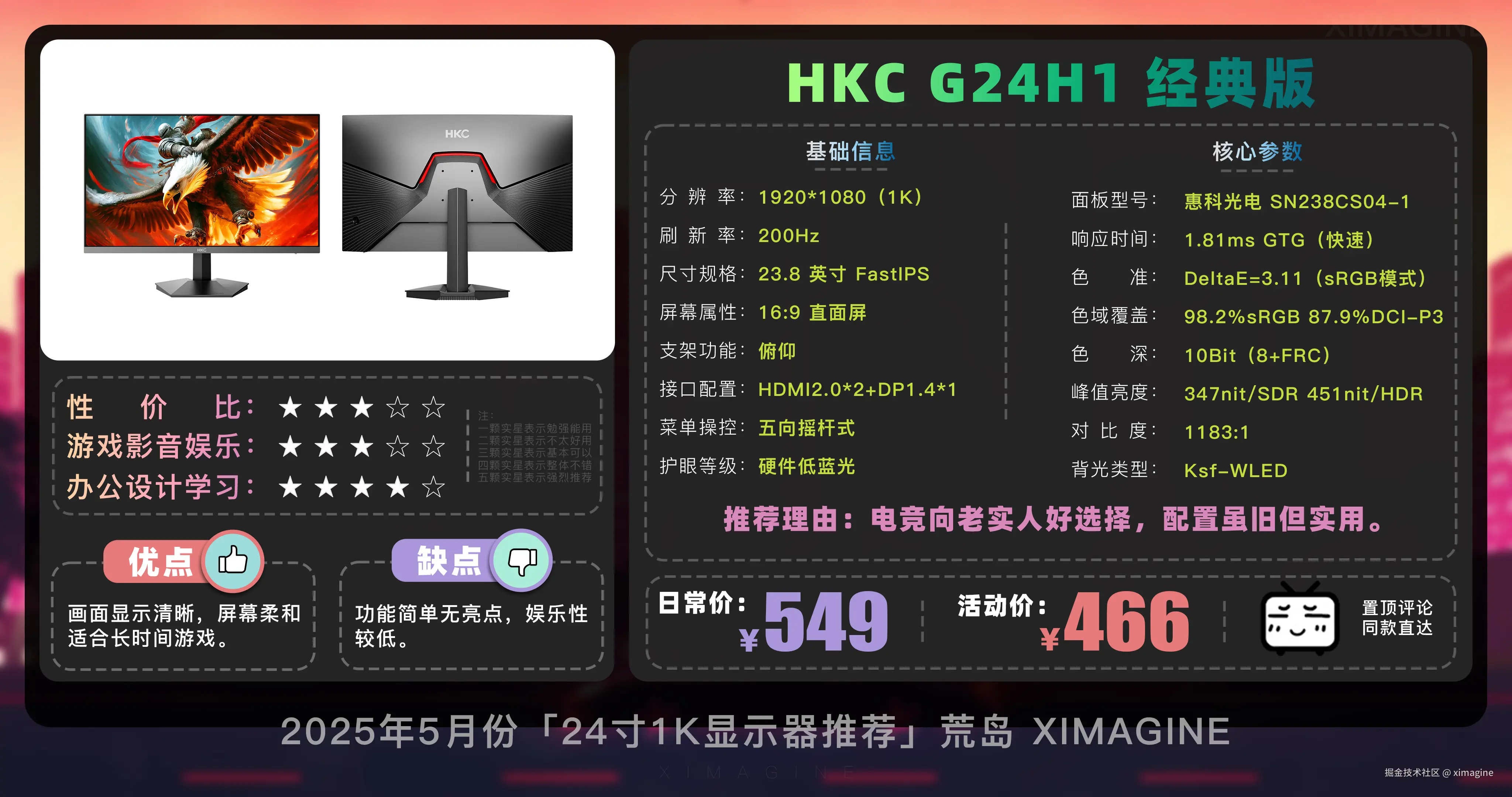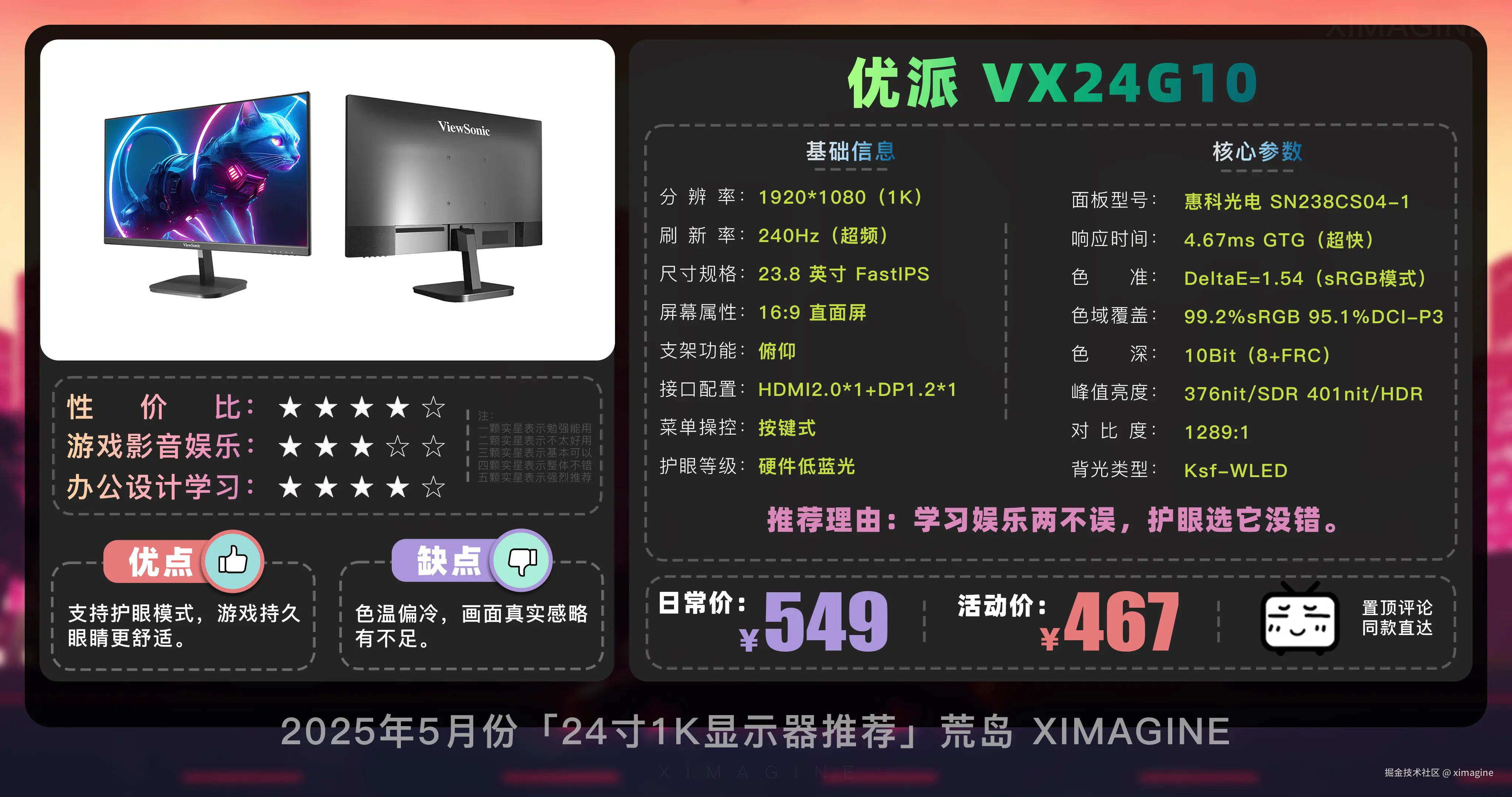 即使预算少, 24 寸 1K 显示器也能拥有丝滑游戏体验,入门电竞别被参数骗了,体验好才是真香屏!本期就到这,视频中推荐的显示器型号,有心水的,可在置顶评论区一键直达,如果觉得视频对你有所帮助,请三连支持!我是「ximagine」,下期再会!