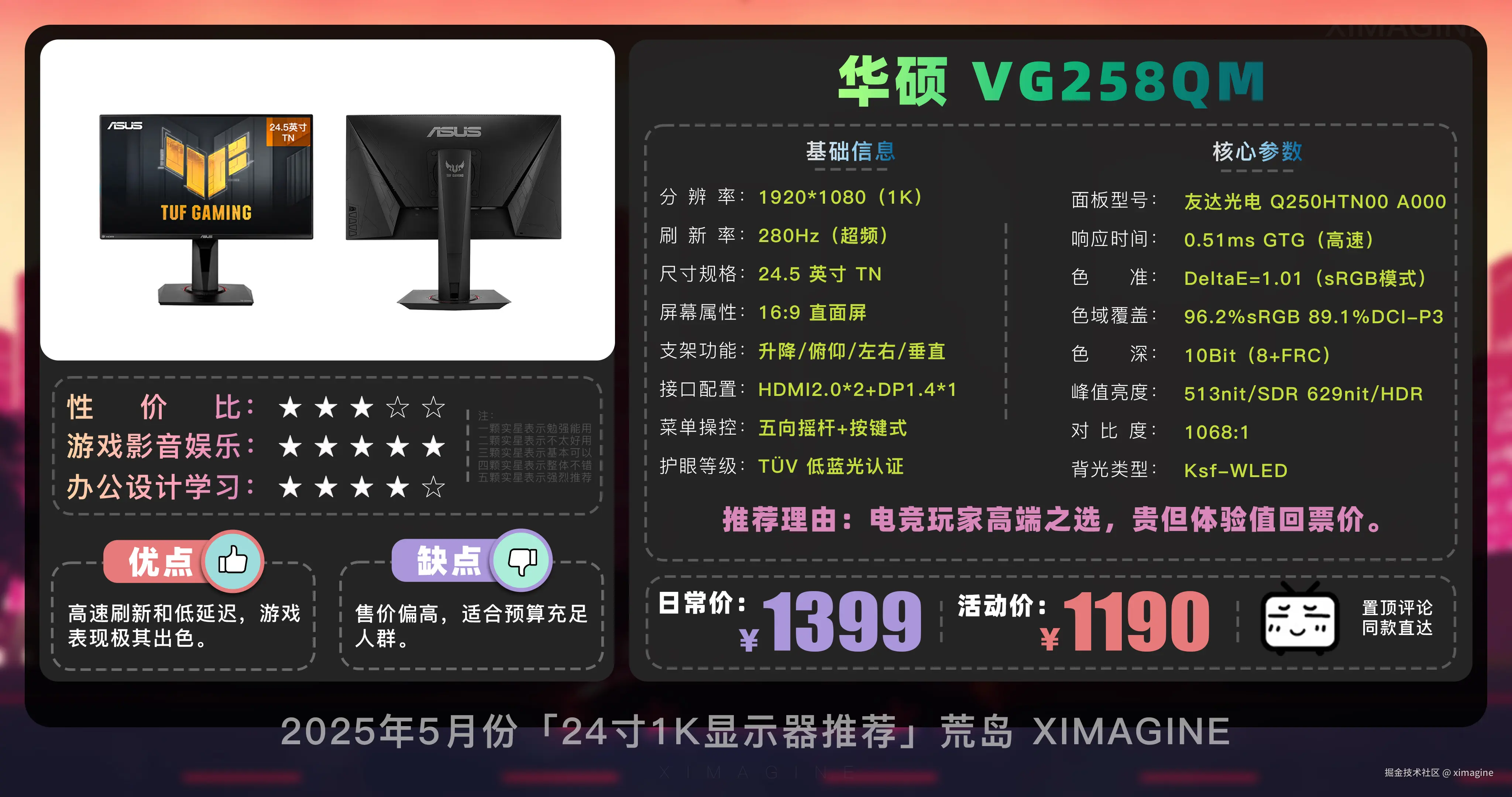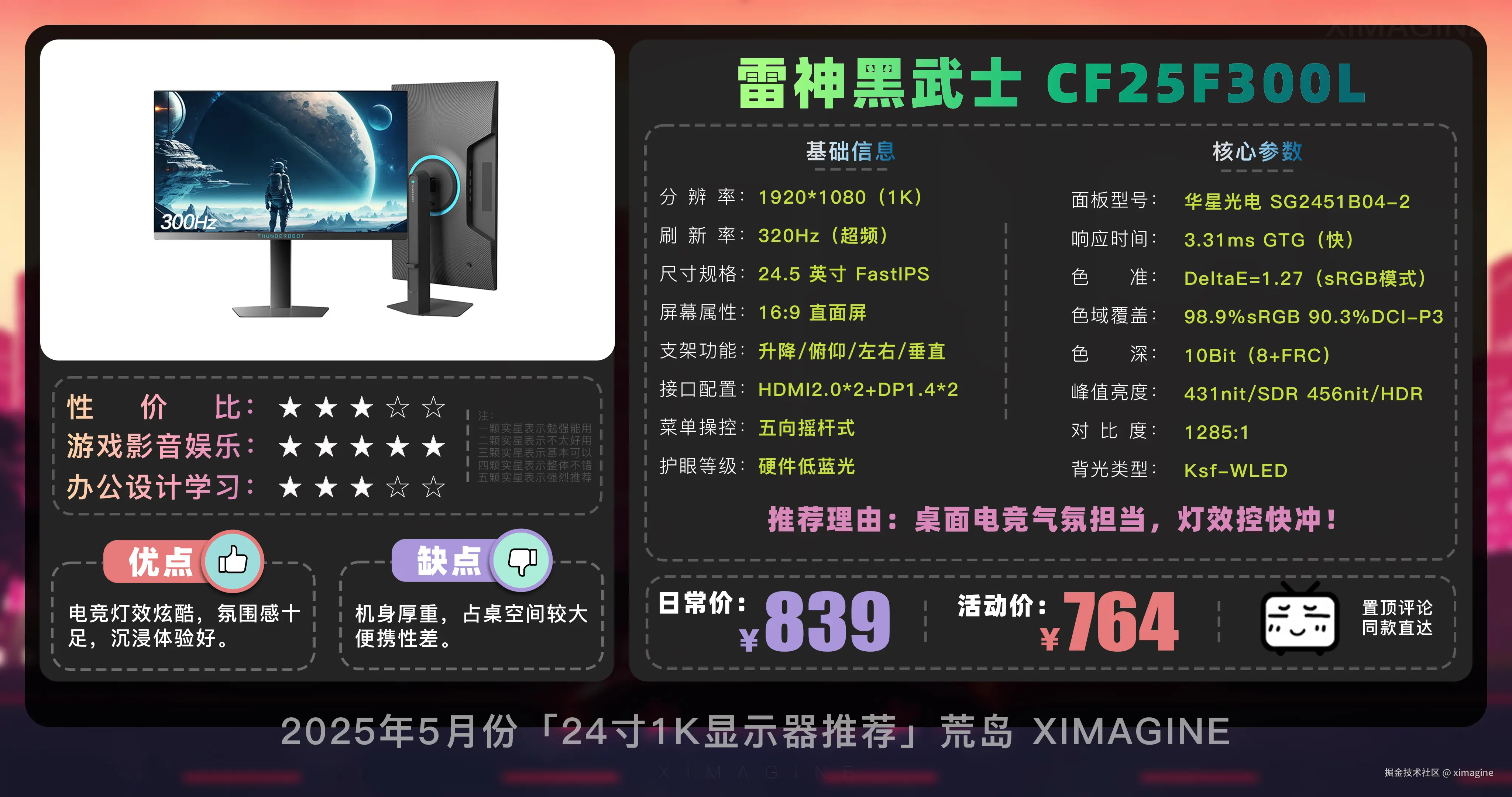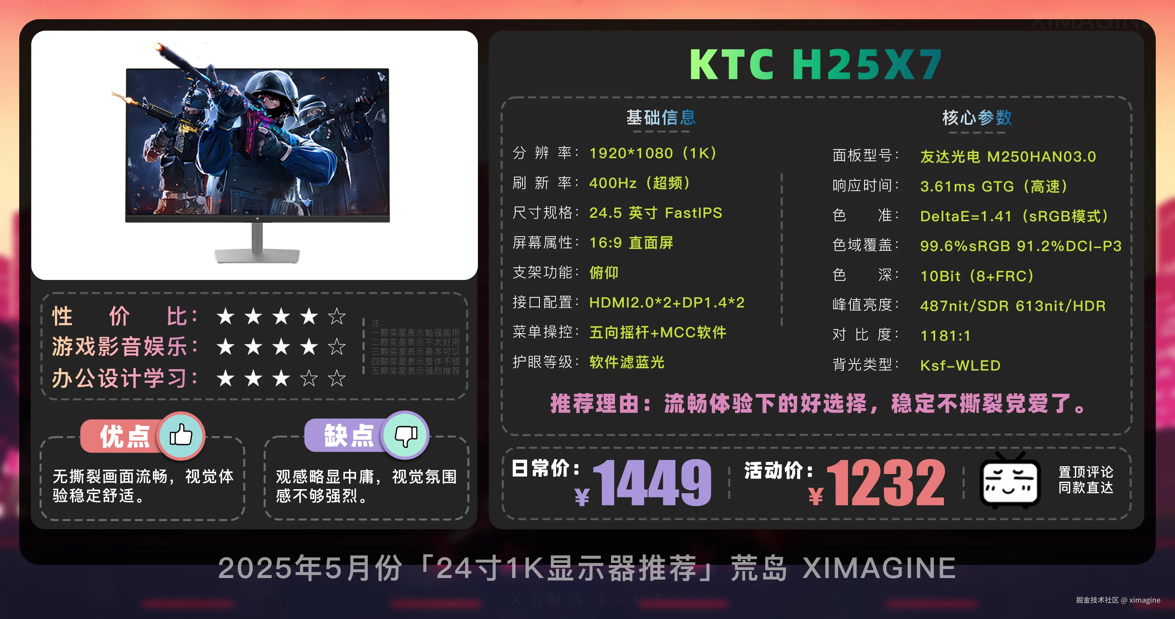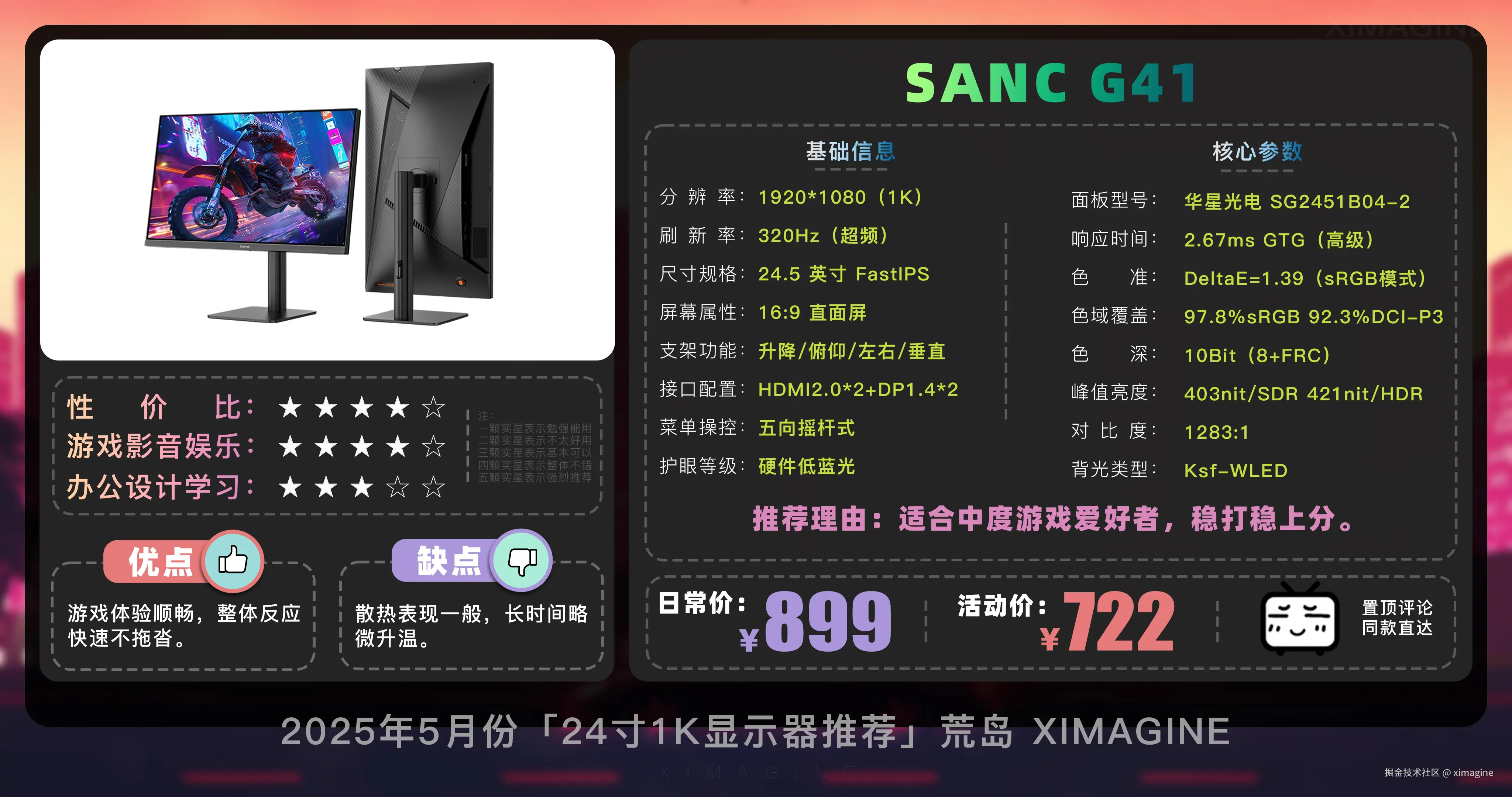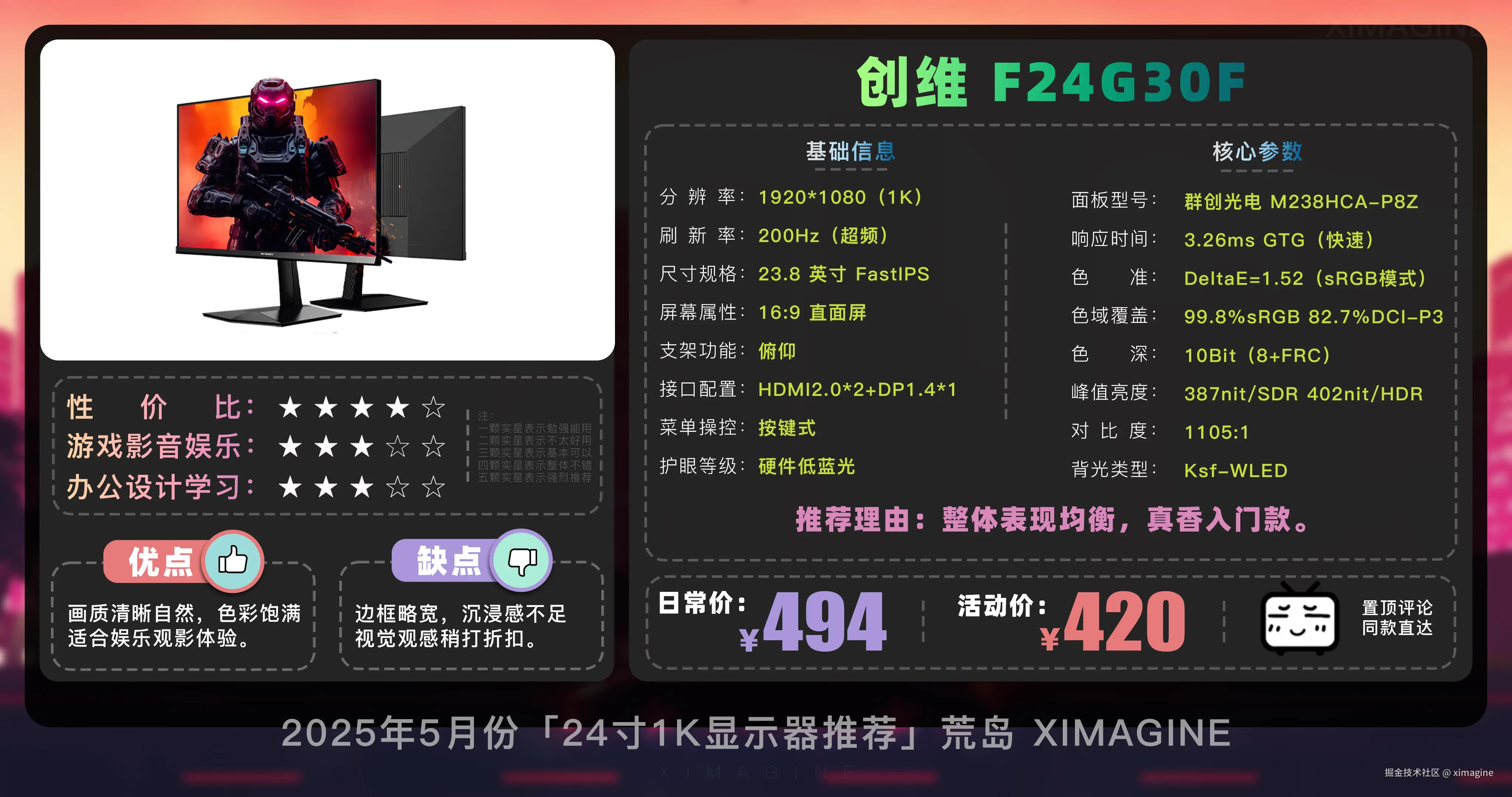 即使预算少, 24 寸 1K 显示器也能拥有丝滑游戏体验,入门电竞别被参数骗了,体验好才是真香屏!本期就到这,视频中推荐的显示器型号,有心水的,可在置顶评论区一键直达,如果觉得视频对你有所帮助,请三连支持!我是「ximagine」,下期再会!