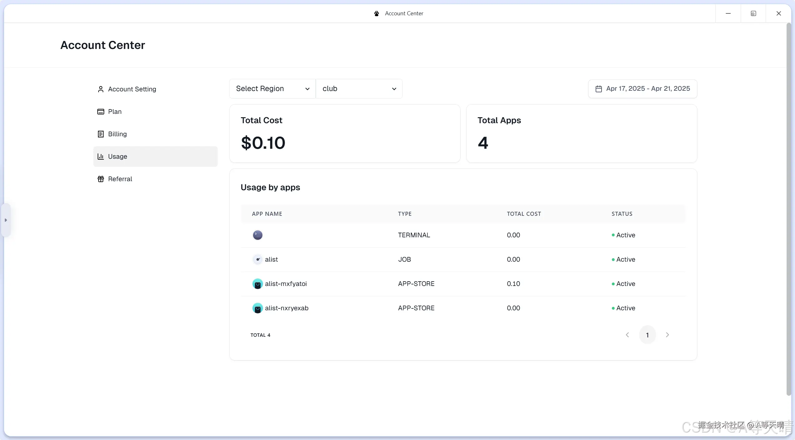 你只需要在主页这里的Usage就可以看到你的花费