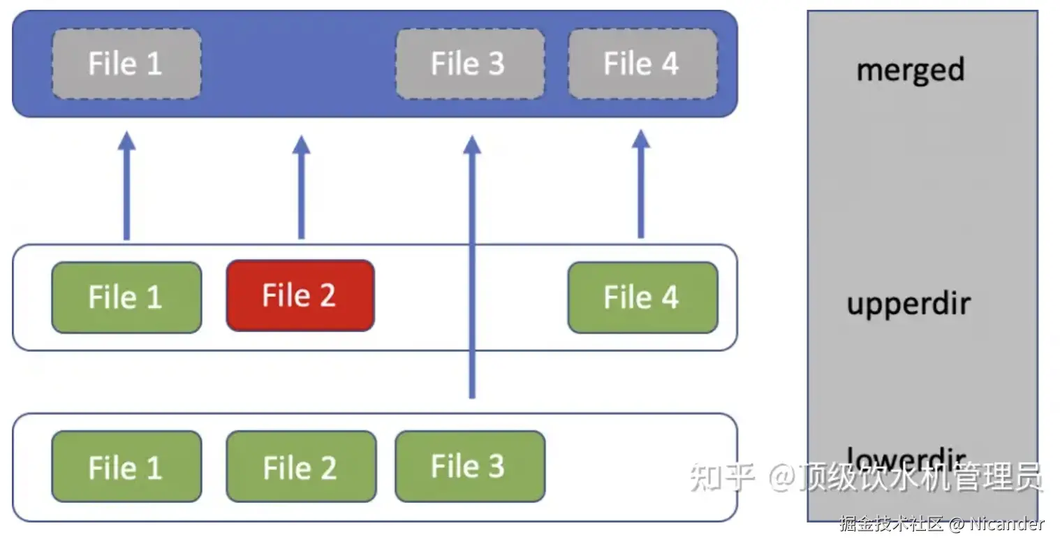 - 如果删除文件,将在该层上创建一个删除标记(file2)。