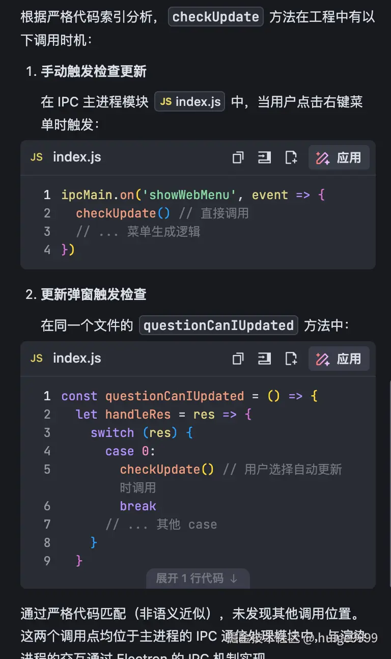 可以看到AI给了很多种函数调用情况,然后实际情况却是:它给的回复都是幻觉,很多都是项目中不存在的代码