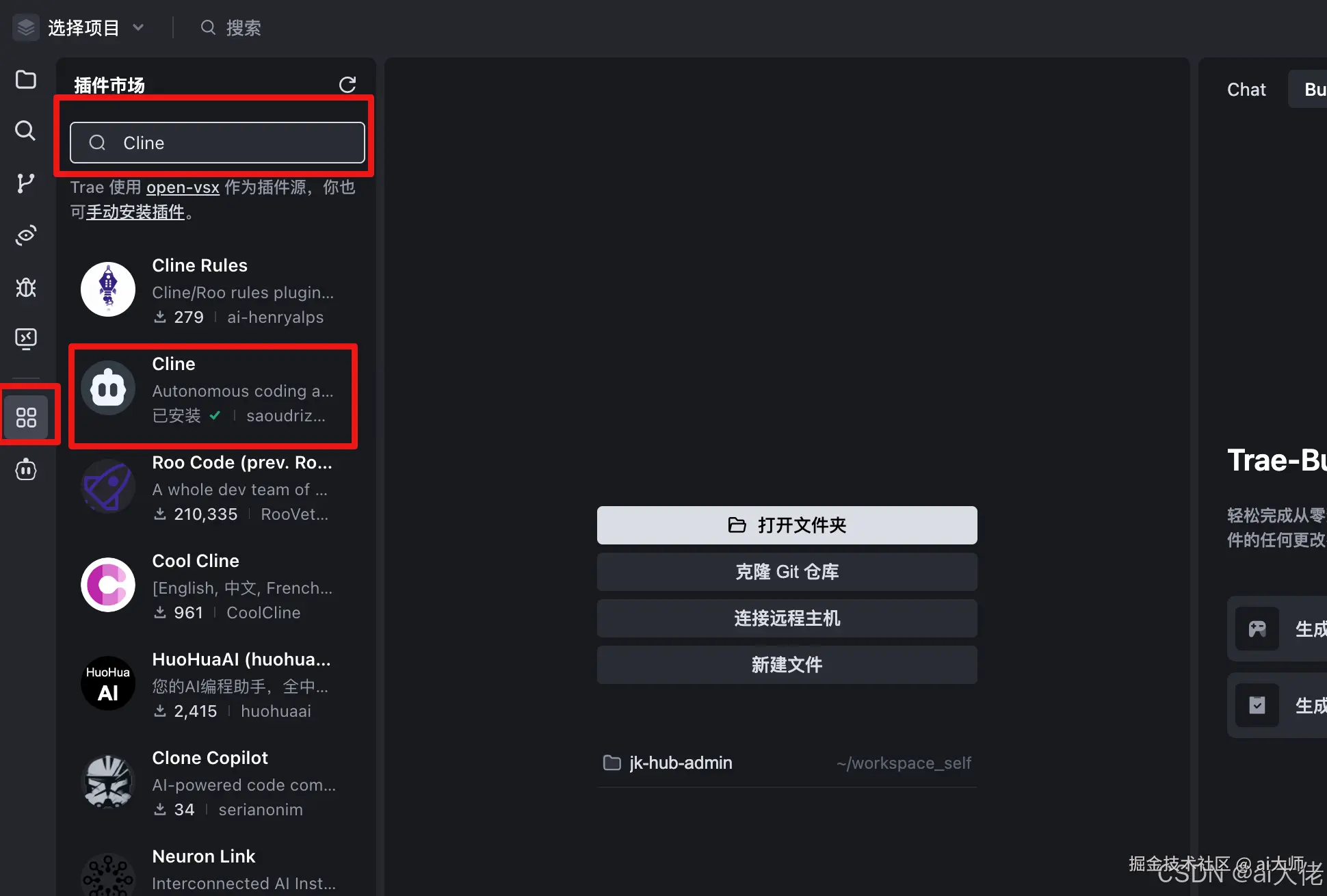 用户可以通过打开插件市场,进入插件面板,搜索并找到 Cline 插件,从而进行安装和配置。