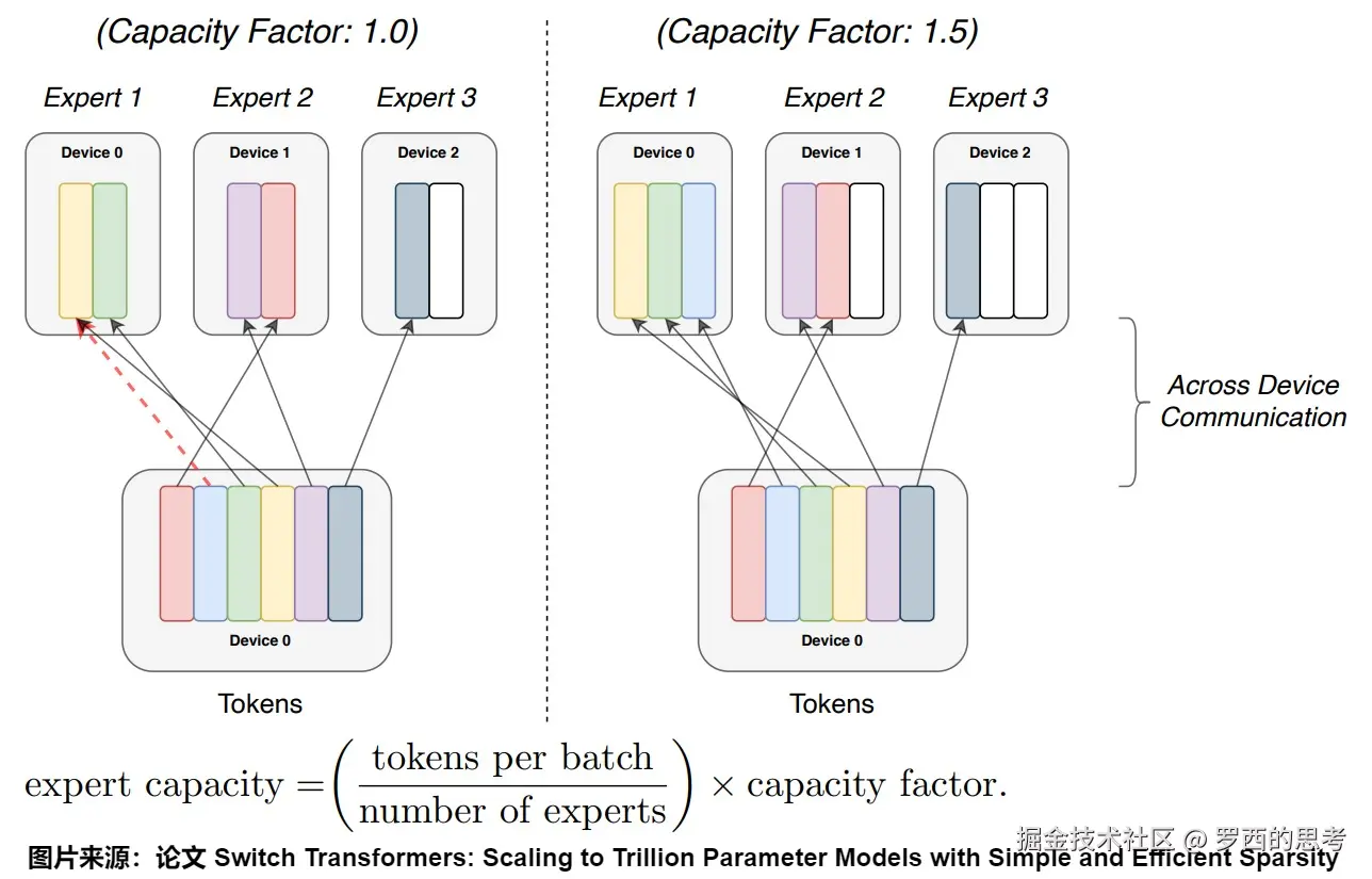 Switch Transformers的模型是面向TPU,其要求所有张量形状都是在编译期间内静态固定的。但因为路由是动态的,因此路由到每个专家的张量形状也是动态的。为了解决这一问题,Switch Transformers使用了专家容量(Expert Capacity)。如下图所示,专家容量为每个batch中总 Token 数除以专家数,然后再乘以容量因子(Capacity Factor),即可得到专家容量(每个专家对应的 Token 数)。该变量决定了可以路由到任何一个专家的最大token数量。如果当前专家接收到的token数已经超过了容量,那么它就不再接收token了,此时我们称这些路由到已满容量的专家的token为溢出token。