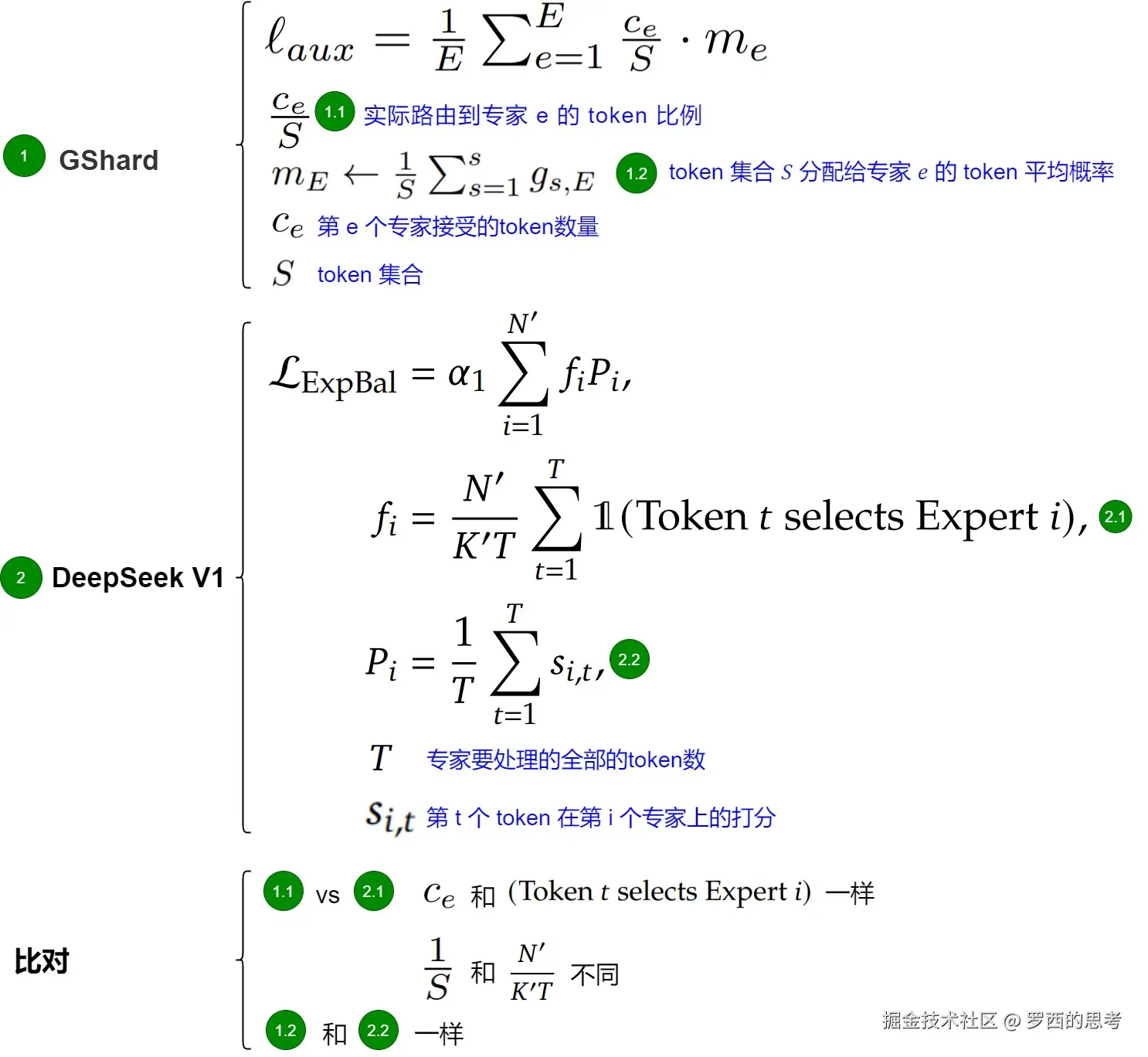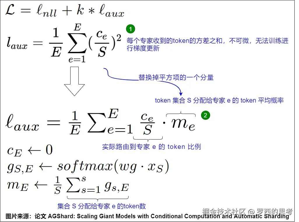 对于损失函数的设计,有一个简单的想法:例如有 S 个token,E 个专家,假设是第 e 个专家接受的token数量。如果MoE是负载均衡的,那么每个专家收到的token一样多,token比例应该是相同的。因此GShard把每个专家收到的token的平方和定义为负载均衡损失(见下图标号1),所有专家收到token比例都相等时,得到最小值。但是是从top-k函数中导出,不是可微的。而且,这样的辅助损失函数并不包含Gating函数的参数,无法训练进行梯度更新。于是GShard中引入了一个做法, 把平方项的一个分量替代成Gating softmax的均值(见下图标号2),因为和有一定依赖关系,对的调整也会影响,从而实现对各专家负载分配的调节。