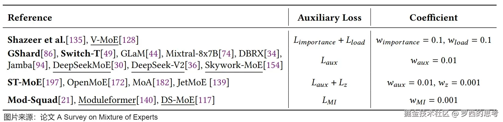 仅仅加入噪声是不够的,人们针对这一问题提出了多种解决方案。其中,最常用的策略是为负载均衡添加辅助损失函数(Auxiliary Loss)和基于专家来施加的一些策略,比如专家能力和专家选择(Expert Choice)。