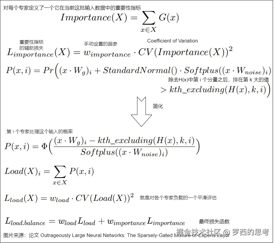 因此,MoE模型中需要控制专家均衡。为了对抗这种不平衡,人们实施了各种负载均衡技术,目的是确保所有专家在训练过程中大致承担相等的责任。我们在前一篇就介绍过,在门控中加入噪声机制可以避免反复路由到同一个专家,让门控在做出选择时跳过几个最优专家模型,去选择其余的专家模型,从而更好地协同工作。具体如下。