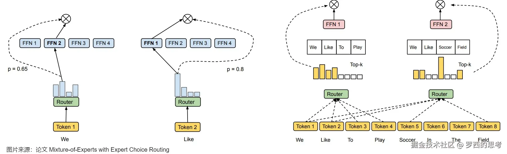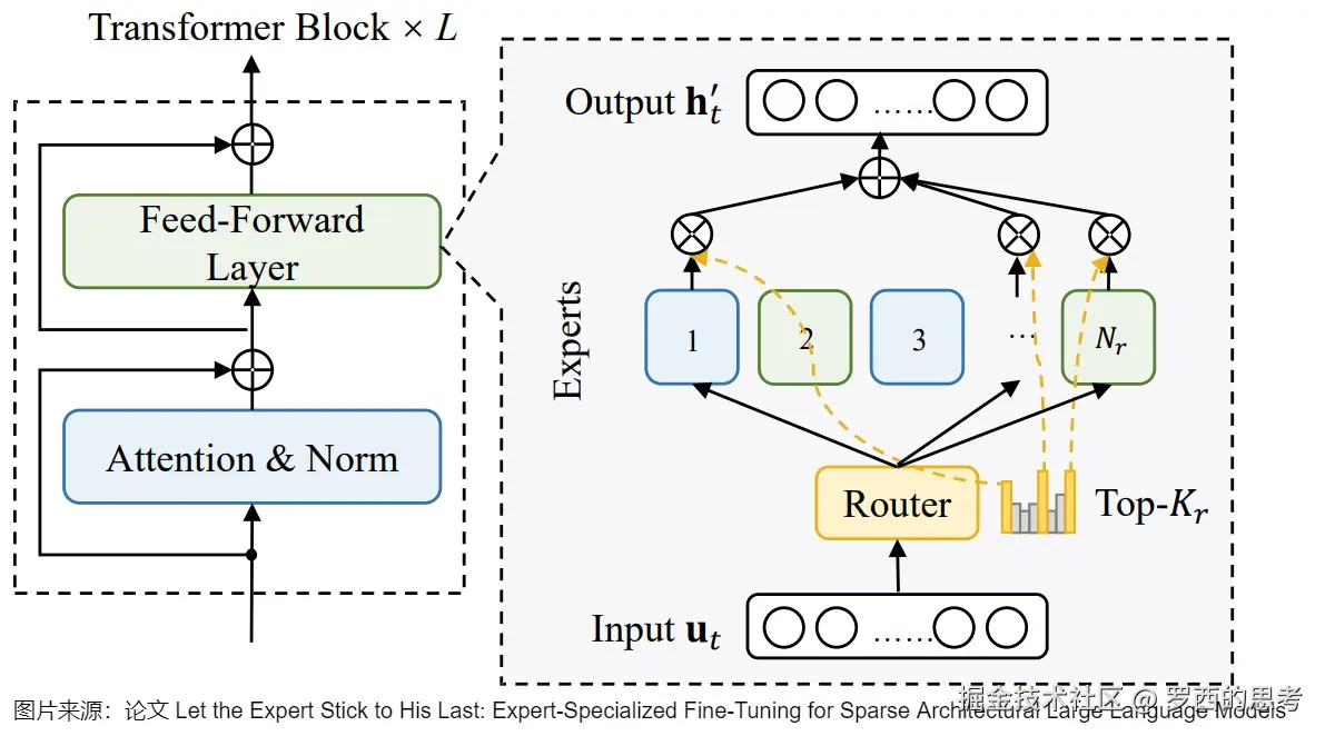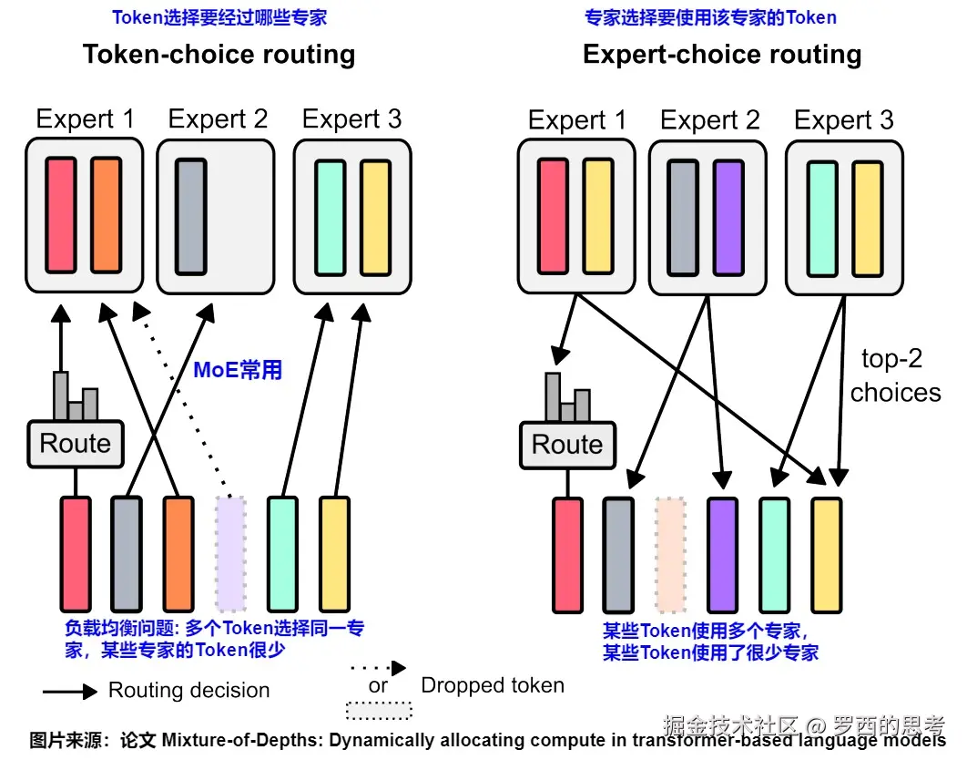 - 专家容量 (Expert Capacity),约为 (如果共有 N 个 token,E 个专家)。一旦某个专家被分配的 token 超过了这个容量,就可能丢弃一些 token(或者通过残差连接导入到下一层再处理)。