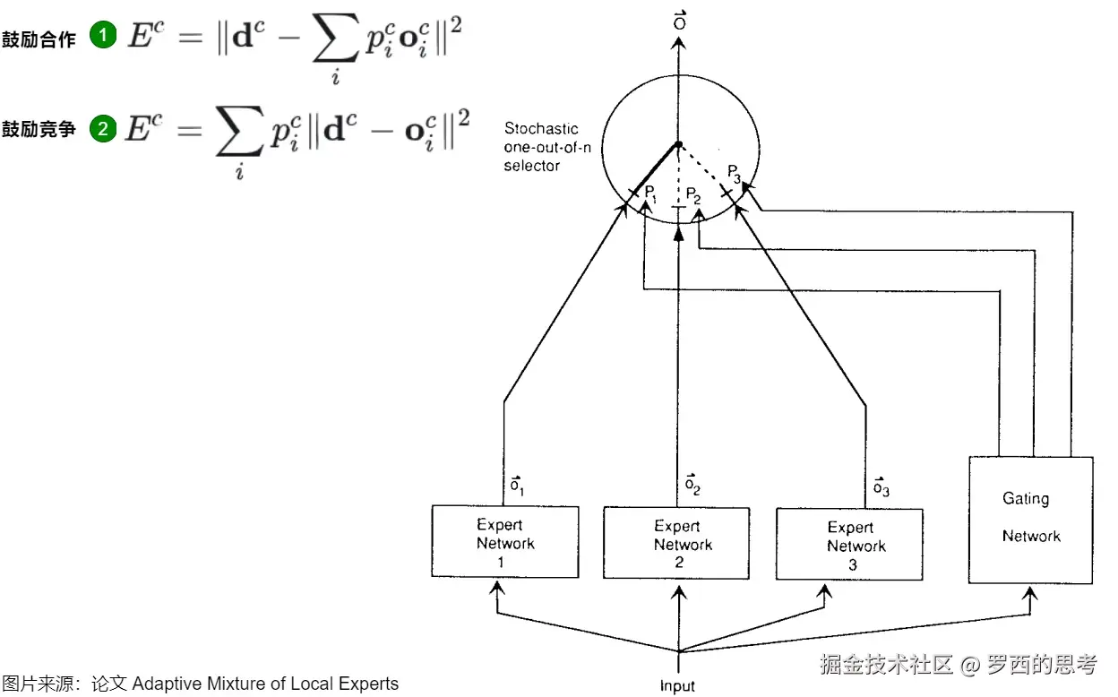 最早的损失函数来自论文“Adaptive Mixture of Local Experts”。有两种损失函数,分别对应下图的标号1和2。其中,对于数据c,是第 i 个专家占的比重,由门控网络控制,是第 i 个专家的输出,是最终期望的整体输出。