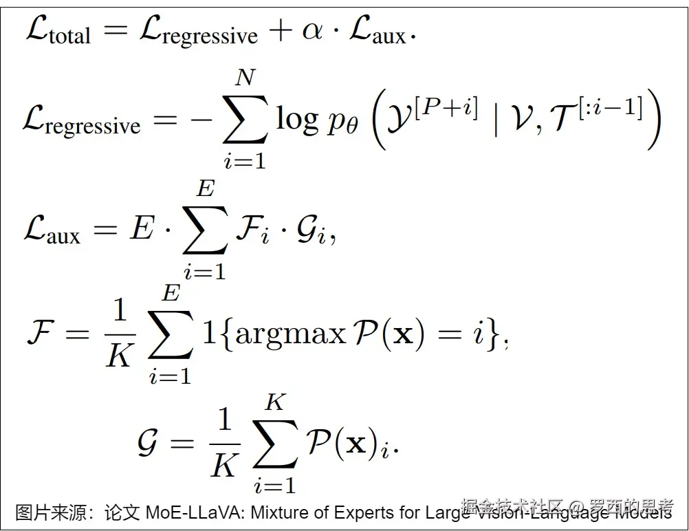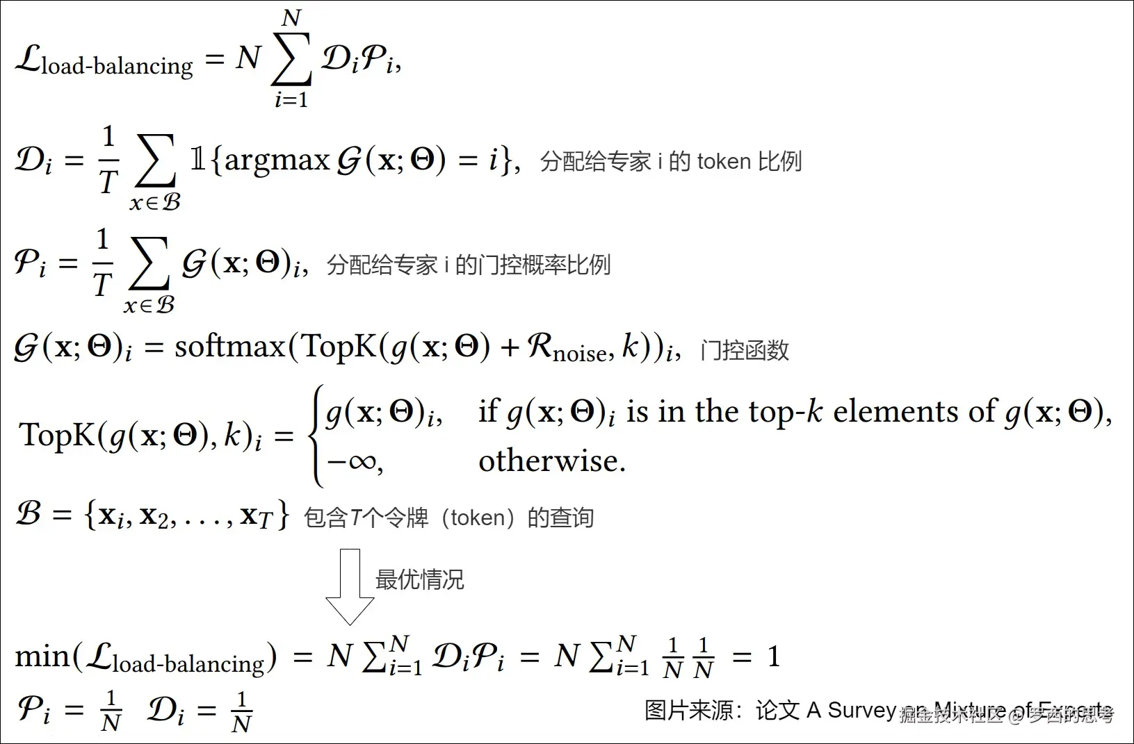 论文"A Survey on Mixture of Experts"给出辅助损失函数的定义如下图,N 是专家数量,T 是 token 数量,K 是每个 input token 激活的专家数量。为确保T个令牌(token)在N个专家间的均匀分布,应最小化负载均衡损失函数。下图也给出了损失函数的最优情况,此时,每个专家都获得等量的分发token,Di = 1/N,以及相等的门控概率比例 Pi = 1/N。这样可以维持所有专家间的负载均衡,确保工作量均匀分布。