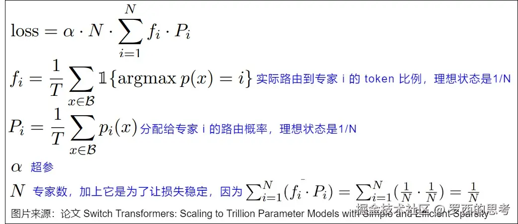 为了进一步防止 token 被丢弃,Switch Transformer 引入了简化版的辅助损失(类似 GShard 的辅助损失)来平衡重要性分数并在专家之间执行负载均衡,以希望每个专家从批次中获得的token数量大致相等。具体如下图所示,其中 α 是一个超参数,用于在训练过程中微调此损失的重要性。值过高会影响主要损失函数,而值过低则无法有效进行负载平衡。