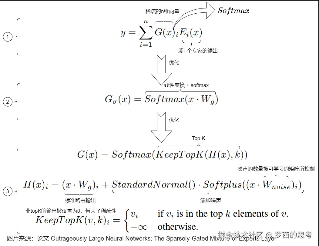 - 但是这样依然不够,因此我们在进行softmax之前,先使用一个topk函数,只保留最大的k个值,其他都设为-∞。这样对于非TopK的部分,由于值是负无穷,这样在经过Softmax之后就会变成 0,不会被选中,就得到了稀疏性。在这个基础上,我们在输入上再加上一个高斯噪声,迫使路由决策保持概率性。此处对应下图标号3。