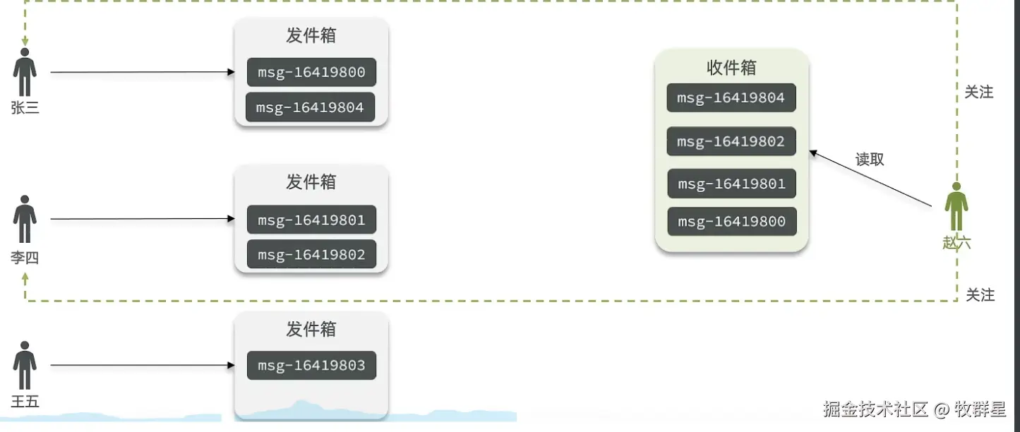 - 拉模式:该模式的核心含义就是:当张三和李四和王五发了消息后,都会保存在自己的邮箱中,假设赵六要读取信息,那么他会从读取他自己的收件箱,此时系统会从他关注的人群中,把他关注人的信息全部都进行拉取,然后在进行排序