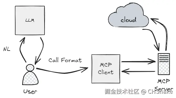 看流程,Call Format是LLM给出的调用外部工具的特定格式,MCP描述的就是从这里开始如何规范使用外部工具的协议。