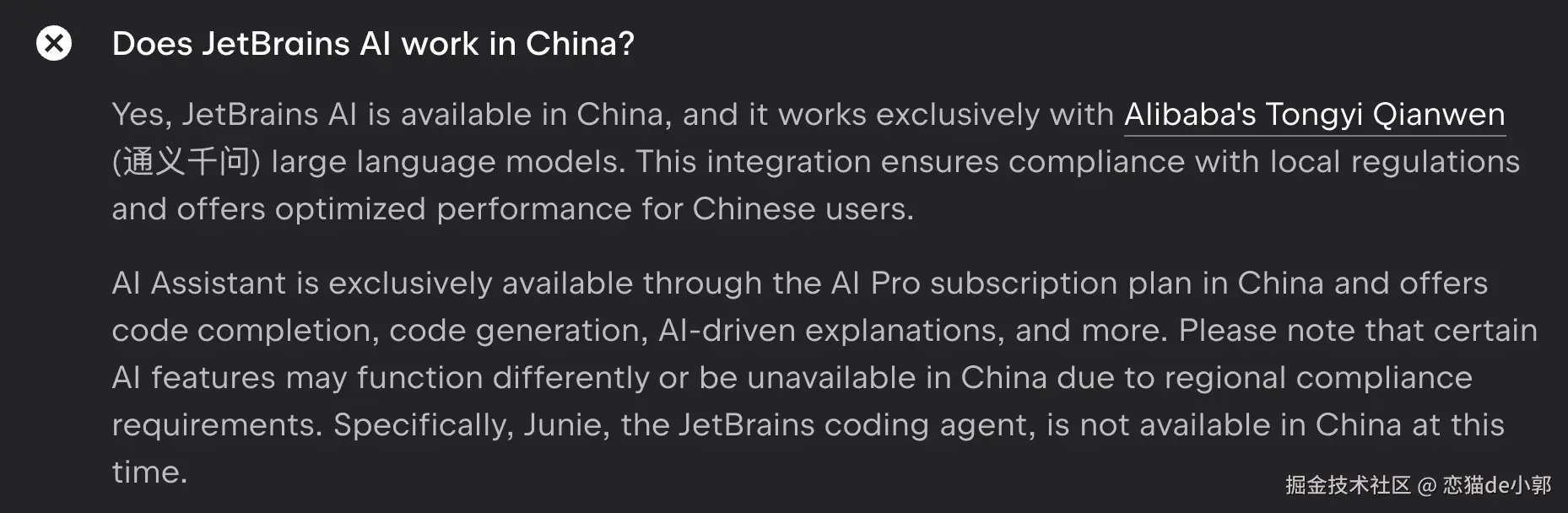 不过有个特殊的的地方,那就是 JetBrains 的 AI 在国内正版支持的模型是 Qwen ,并且 agent 也不支持国内使用: