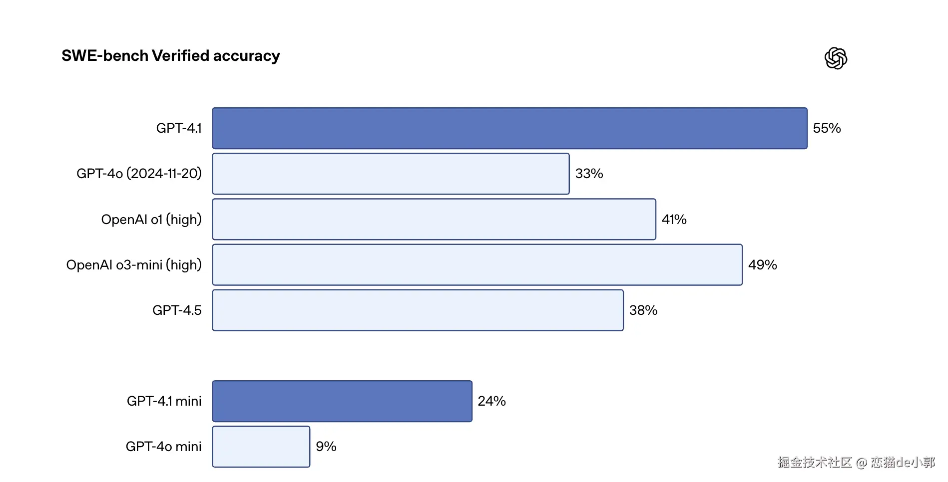 不过, GPT-4.1 在代码领域的表现还是相当出色,比起 4o 有了不少提升,而且比凉了的 GPT-4.5 还好: