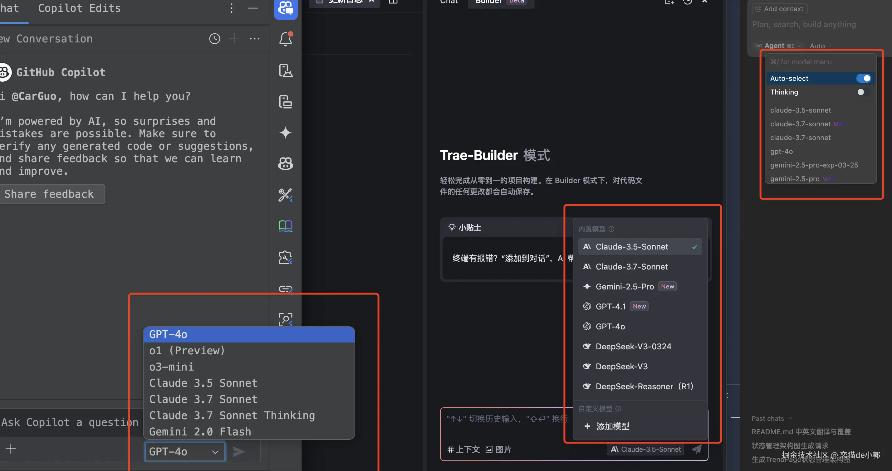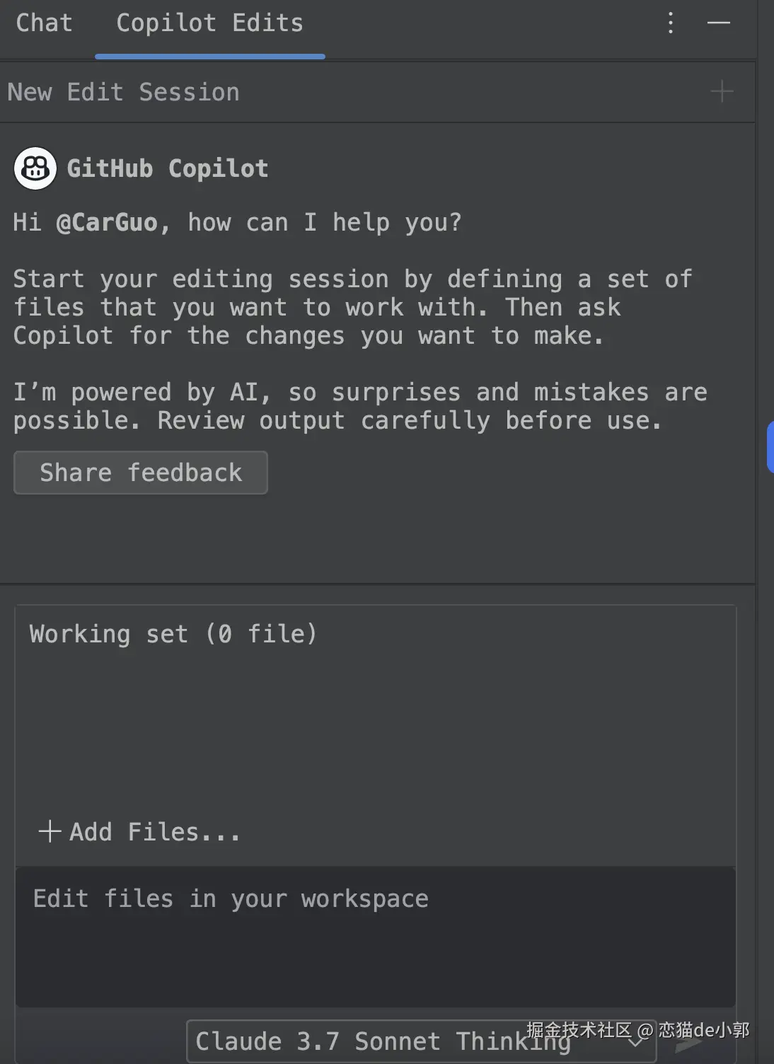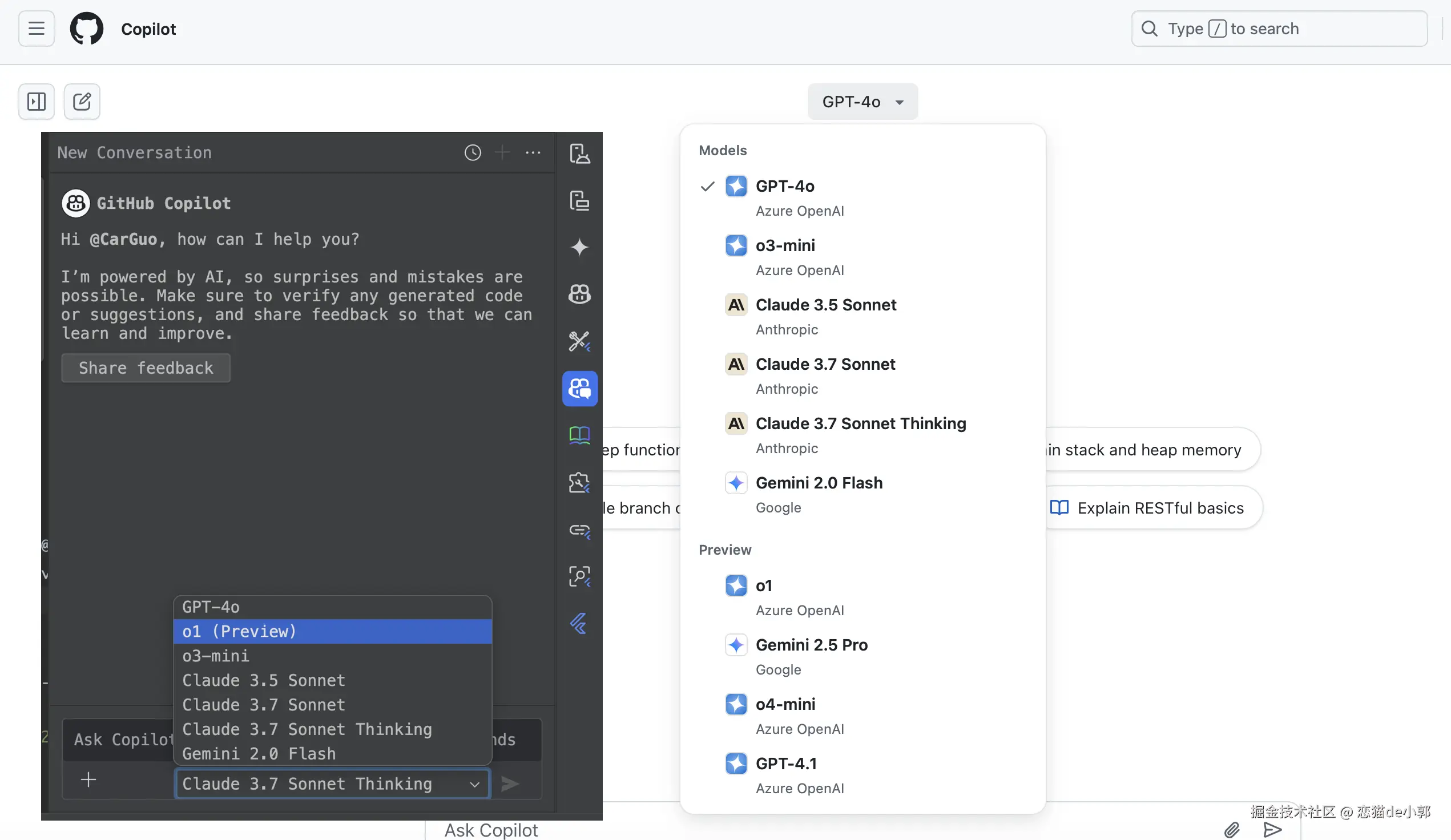 Anthropic 家的 Claude 相信程序员都不会陌生,基本上它是程序员在 Copilot 、Trae、Cursor 等场景下的首选,目前主流就 3.5 和 3.7 ,要体验好的基本都是选 3.7 ,并且 3.7 也支持 Thinking ,而对于 Claude 我是不建议直连,基本容易黑,免费场景我更推荐使用 Github 的 Copilot ,目前我是「开源途径」下订阅的免费 Copilot Pro ,不管是在 IDEA 插件还是 Github 网页的 Chat ,基本上 Claude 的每日资源都没遇到过限制: