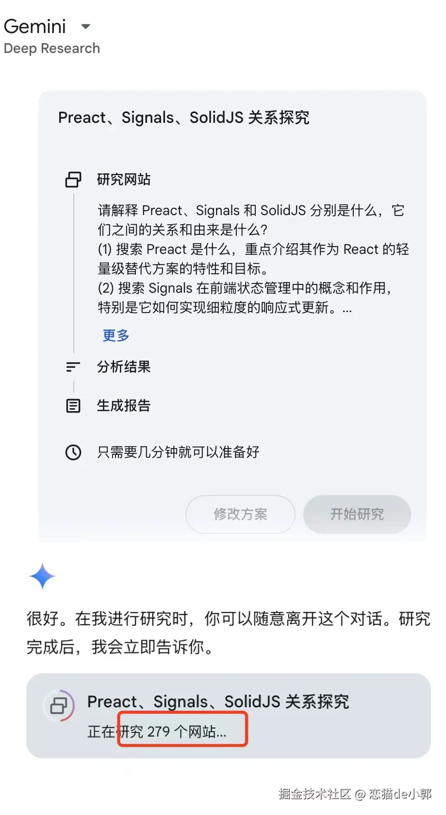 不过这里有点特殊的是,Gemini 的 Deep Research ,它是一个完全独立的选项,选择 Deep Research 之后,首先 Gemini 会让你确定方案,等待你确定后,Gemini 会开启一个深度的研究: