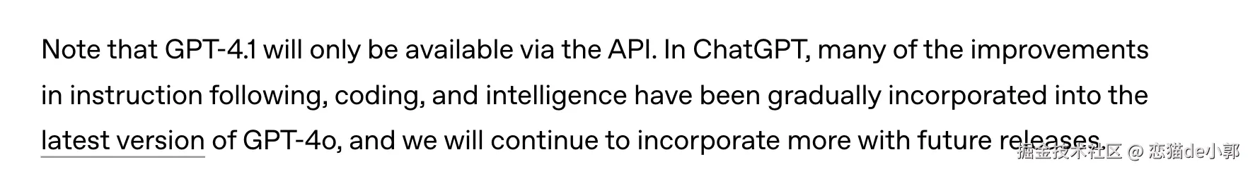 那么问题来了,GPT 4.1 也不是 omni ,也就是它就是个“普通”的模型,所以如果你需要图像和音频等处理,你需要继续用 GPT-4o ,也就是,虽然 GPT-4.1 出来了,但是 GPT-4o 依然稳如老狗,并且 GPT 4.1 目前只在 API 接口提供,在 ChatGPT 还暂不可用:
