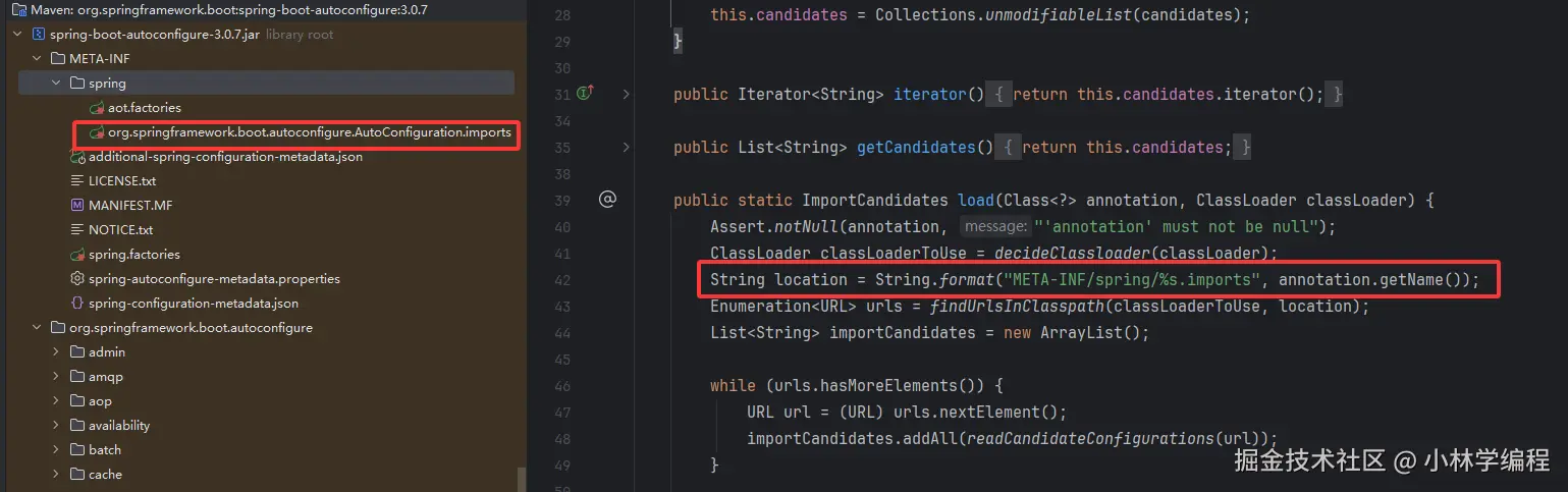 - 通过调用getCandidateConfigurations方法获取所有加载的候选类,这个方法内会从Mate-INF/Spring目录下的autoConfiguration.imports中读取所有自动装配配置类的URL。