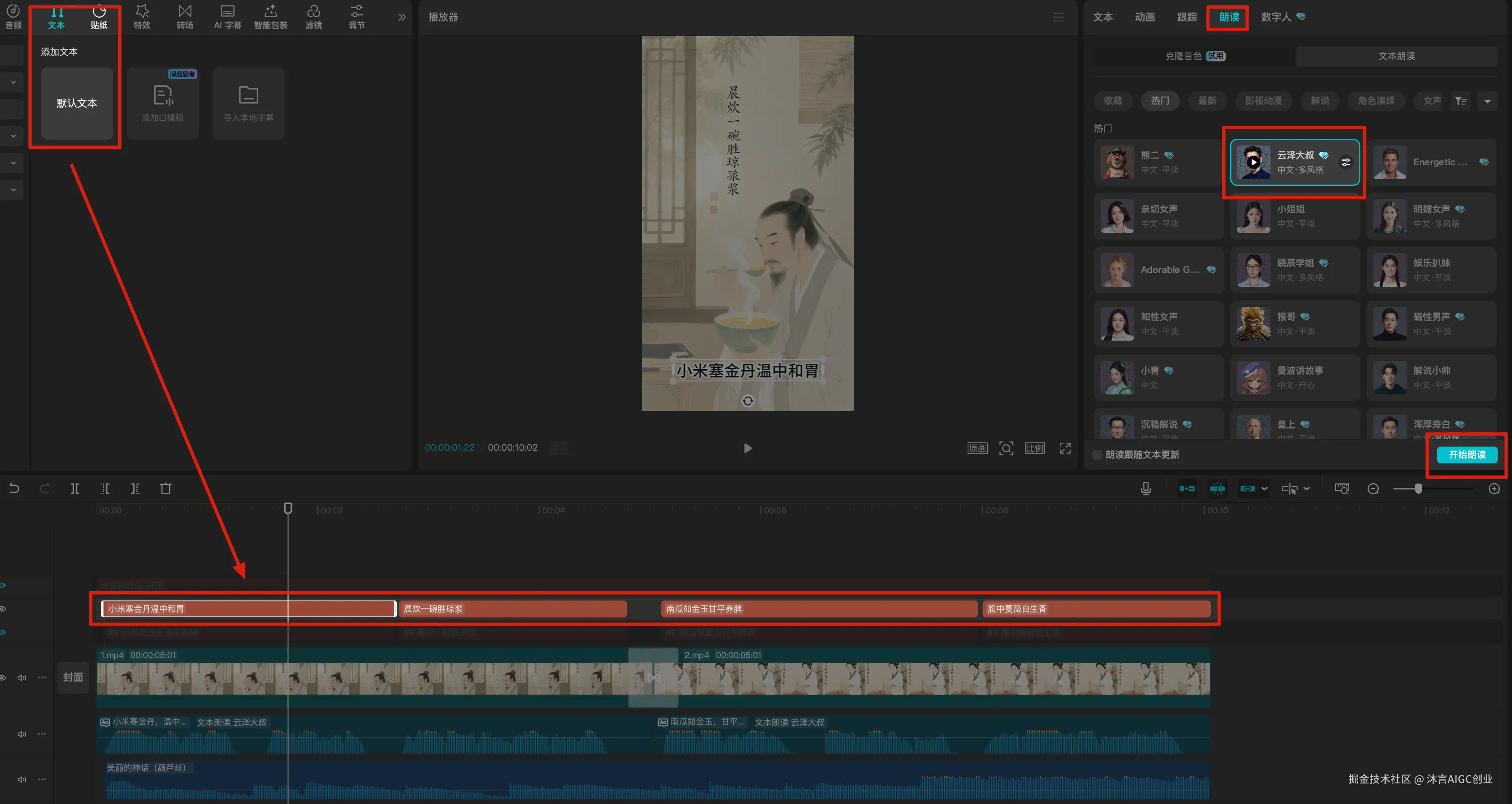 将每一段文案使用朗读音生成音频,音色选择“云泽大叔”声音。如果剪映没有会员也可以使用ttsmaker(免费)或者noiz的声音克隆功能。noiz使用参考我写的这篇文章: